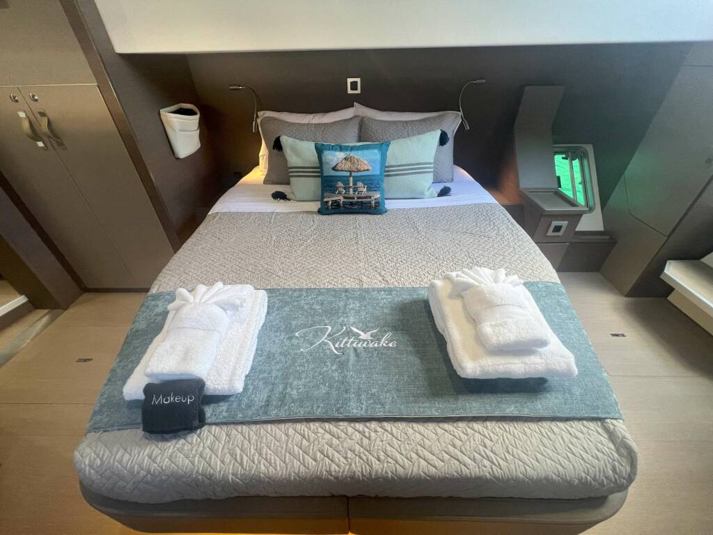 Kittiwake has three spacious and bright staterooms each with a private ensuite. The master cabin encompasses the entire port hull, with multiple large windows to enjoy the view. The starboard side consists of two queen cabins, with walk around beds, and one midship twin bunk cabin (crew cabin), and one queen aft cabin.