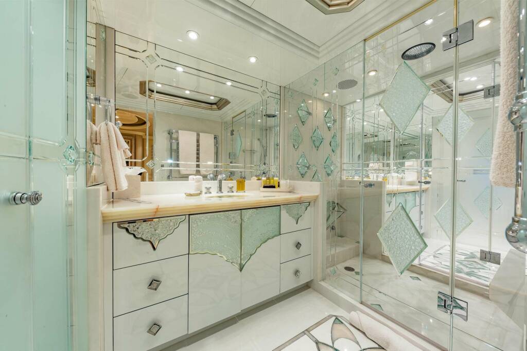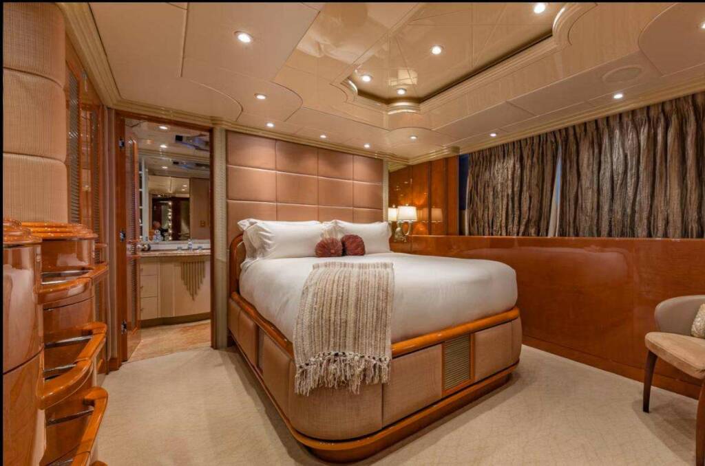 Upon entering the 500 sq. ft. Master Stateroom, there is an Owner office on Stbd side offering beautiful views. Walk-around King bed with Tempur-Cloud Elite mattress, 44" Samsung flat screen TV (Crestron control), surround sound, cozy lounge sofa all amongst soothing natural tones. Vanity with lighted mirror on Port Side. Forward access to en-suite His/ Hers bath separated by a large walk-in shower showcasing a beautiful waterfall feature. Master stateroom has ample closet space along with a separate walk in closet equipped with a personal washer/dryer. Safe.