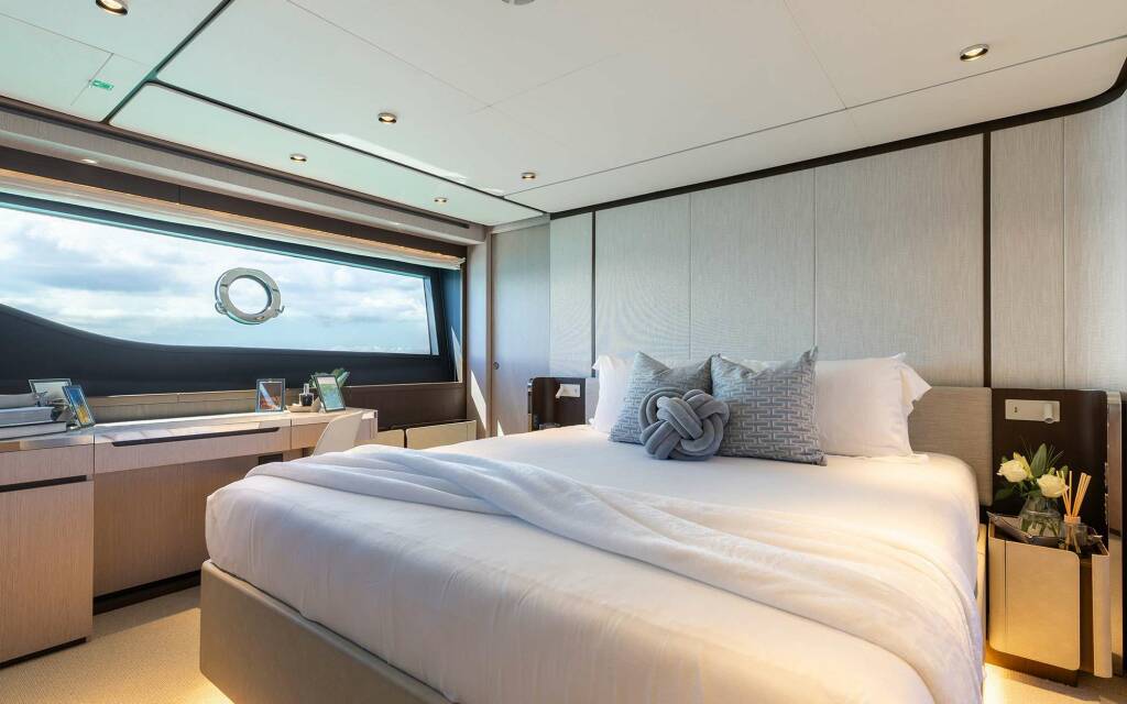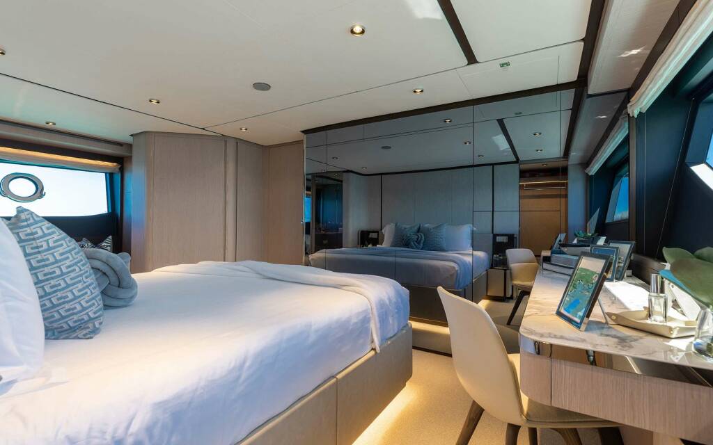 A well insulated Master stateroom with King size bed, walk in wardrobe and ensuite with double sinks/ shower impresses for this size.