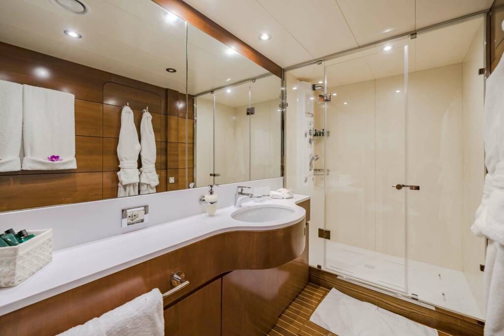 Accommodation: FIORENTE accommodates up to 10 guests in 5 cabins, including 4 staterooms on the lower deck and an additional cabin on the upper deck.