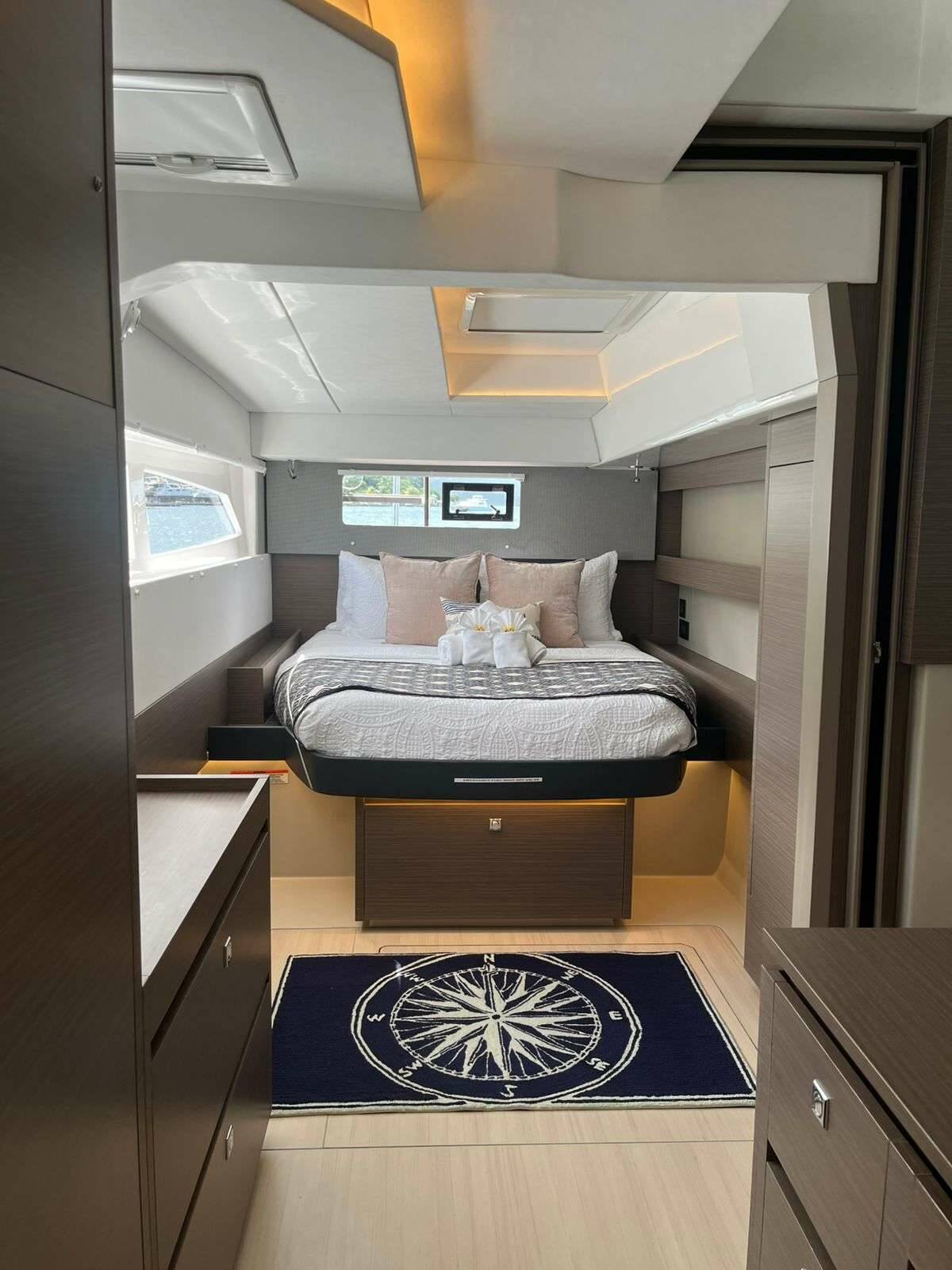 Accommodation: ***Please note that the images on the e-brochure are of not of LIVIN itself as the yacht will be arriving in the BVI at the end of October however this is the layout and the options the owner had chosen. Decor palette is blue, turquoise and a touch of burnt orange.