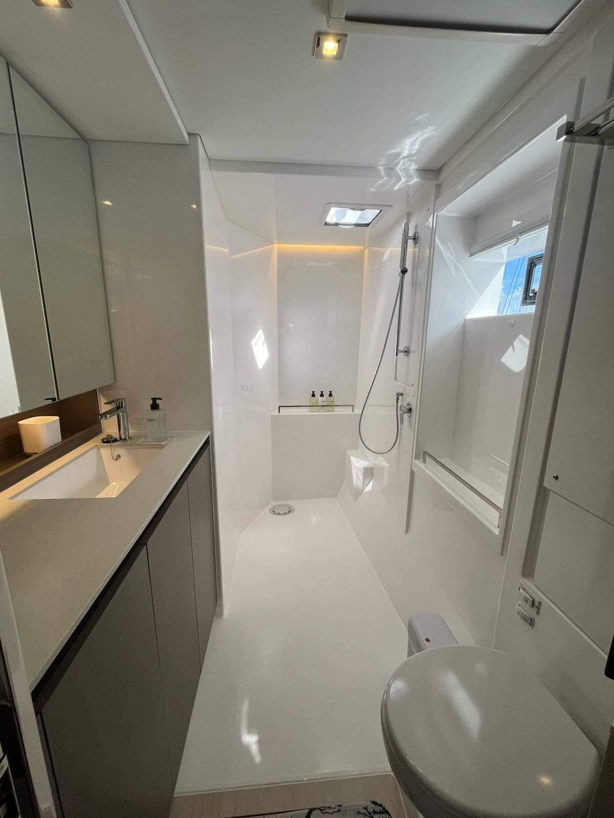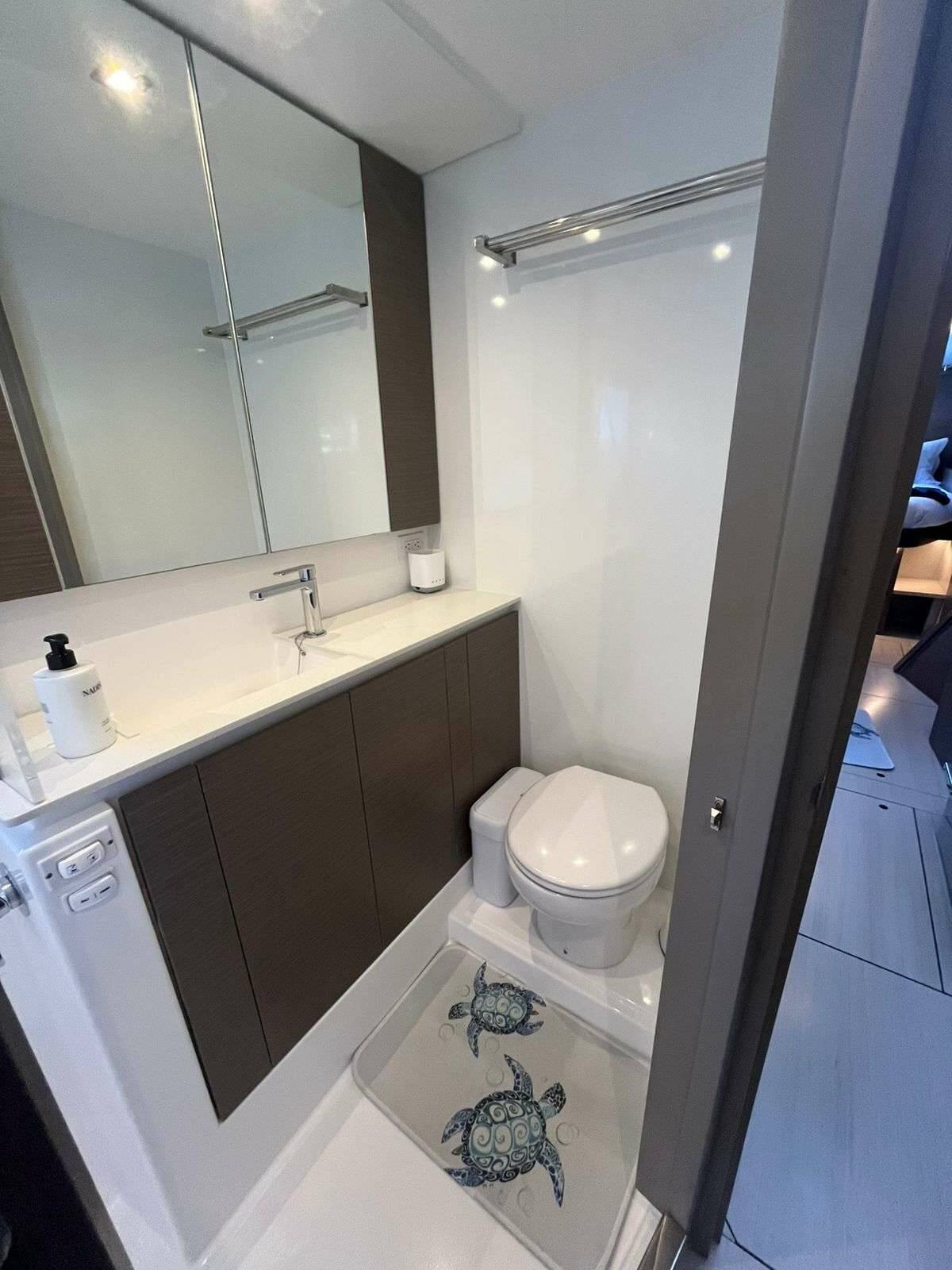 1 master cabin with queen berth, lounge area, dressing table/desk and a large en-suite bath with electric toilet and a large shower. Individual A/C control for guest comfort.