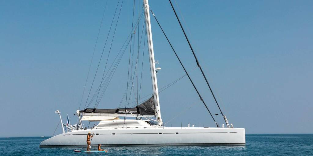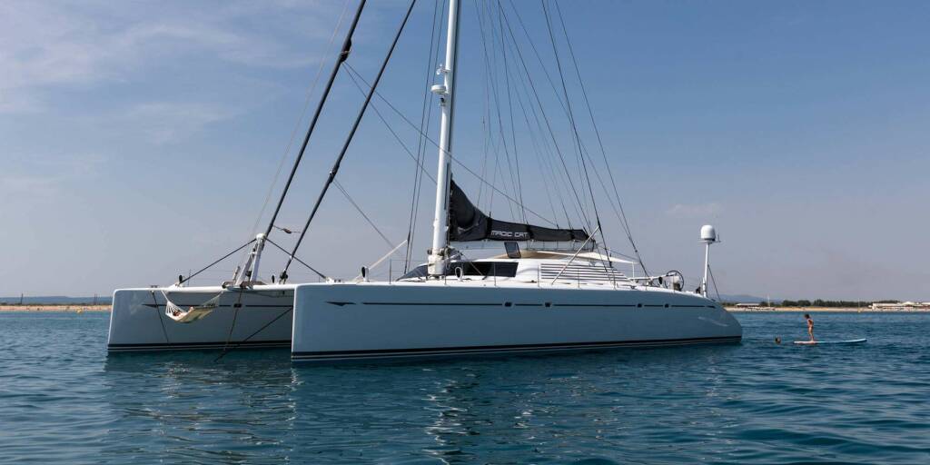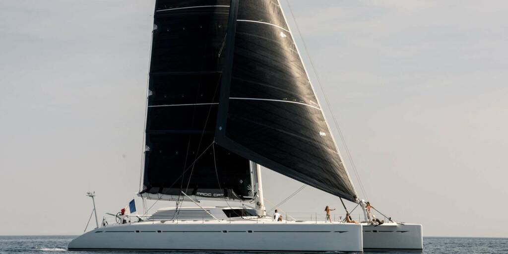 Luxus - Katamaran MAGIC CAT, Baujahr 1995 liegt in W. Med -Naples/Sicily, W. Med -Riviera/Cors/Sard. vor Anker. Sie hat 4 Kabinen, bietet Platz für 8 Personen.