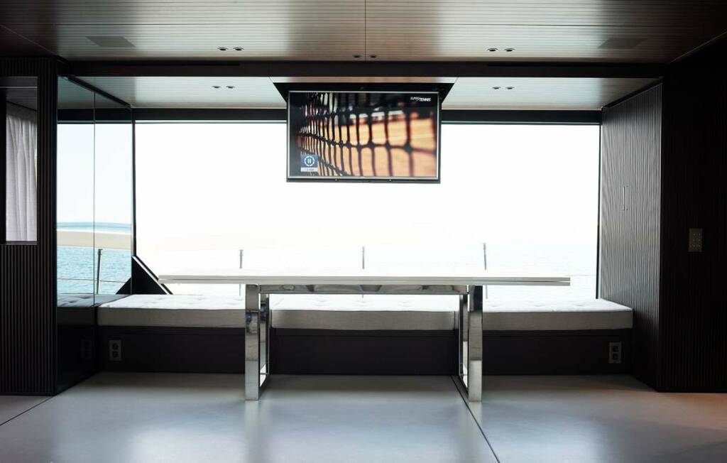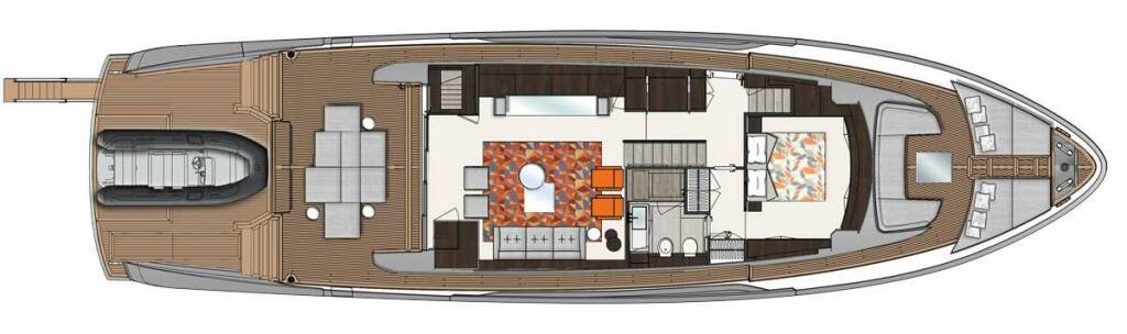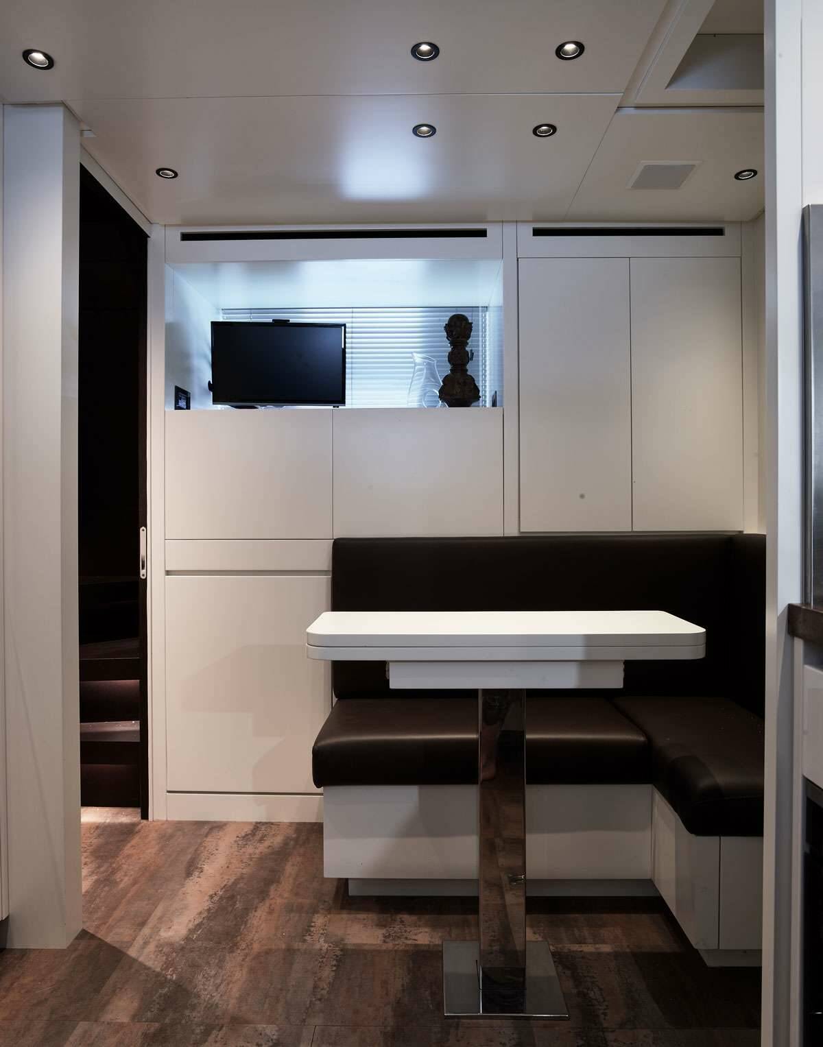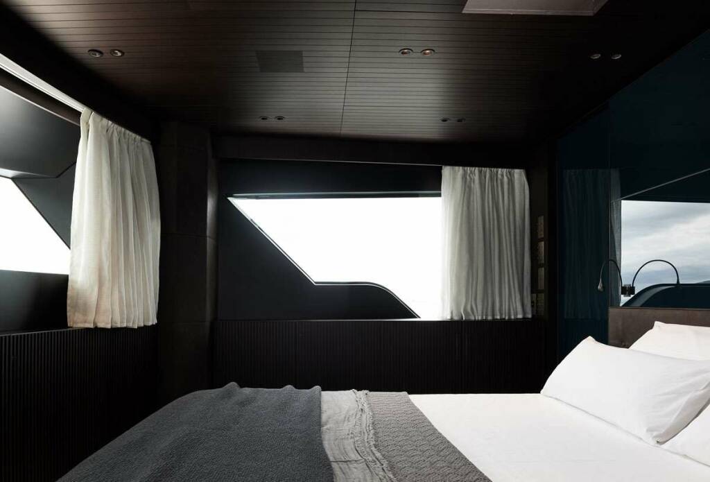 Accommodation: The Sanlorenzo SX 88 Luar offers accommodation to up to 8 (+1)* guests in 4 ensuite guest staterooms. The owner stateroom in the main deck forward, Two VIP cabins and a twin cabin with sliding beds convertible into one double bed in the lower deck.