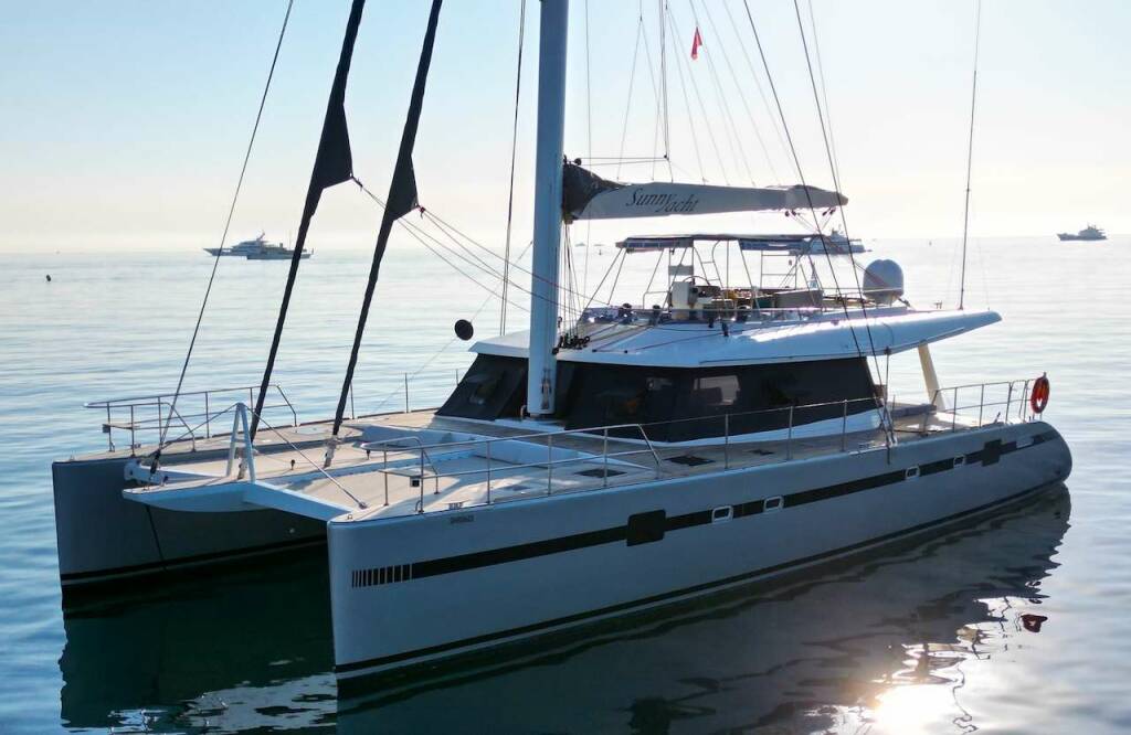 Luxus - Katamaran SUNNYACHT, Baujahr 2008 liegt in W. Med -Riviera/Cors/Sard. vor Anker. Sie hat 3 Kabinen, bietet Platz für 6 Personen.