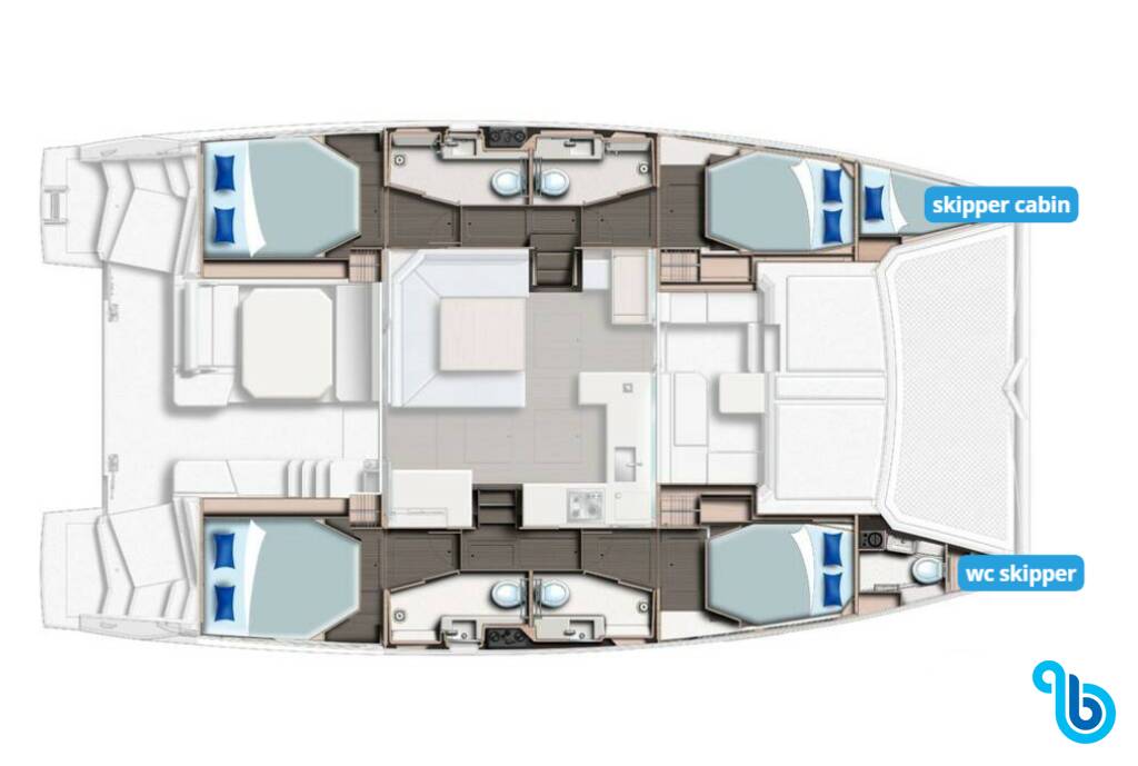 Der Skipper ist nicht im Preis des Bootes enthalten. Es ist möglich, den Skipper während des Bestätigungsverfahrens hinzuzufügen: Die Kosten liegen in der Regel zwischen 180 € und 250 € pro Tag; der Skipper benötigt eine eigene Kabine. Nach Rücksprache mit einem BeBlue-Betreiber ist es möglich, dass der Skipper in der Dinette (zentraler Aufenthaltsraum) schläft.