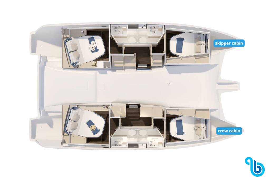 Der Skipper ist nicht im Preis des Bootes enthalten. Es ist möglich, den Skipper während des Bestätigungsverfahrens hinzuzufügen: Die Kosten liegen in der Regel zwischen 180 € und 250 € pro Tag; der Skipper benötigt eine eigene Kabine. Nach Rücksprache mit einem BeBlue-Betreiber ist es möglich, dass der Skipper in der Dinette (zentraler Aufenthaltsraum) schläft.