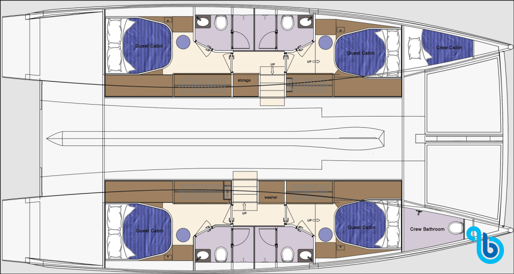 Der Skipper ist nicht im Preis des Bootes enthalten. Es ist möglich, den Skipper während des Bestätigungsverfahrens hinzuzufügen: Die Kosten liegen in der Regel zwischen 180 € und 250 € pro Tag; der Skipper benötigt eine eigene Kabine. Nach Rücksprache mit einem BeBlue-Betreiber ist es möglich, dass der Skipper in der Dinette (zentraler Aufenthaltsraum) schläft.