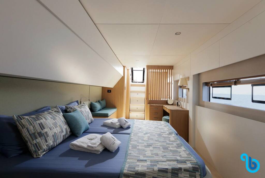 The skipper is not included in the boat price. It will be possible to add the skipper during the confirmation procedure: the cost is usually between €180 and €250 per day plus food; the skipper requires a dedicated cabin. After checking with a BeBlue operator, it will be possible to request that the skipper sleeps in the dinette (central lounge).