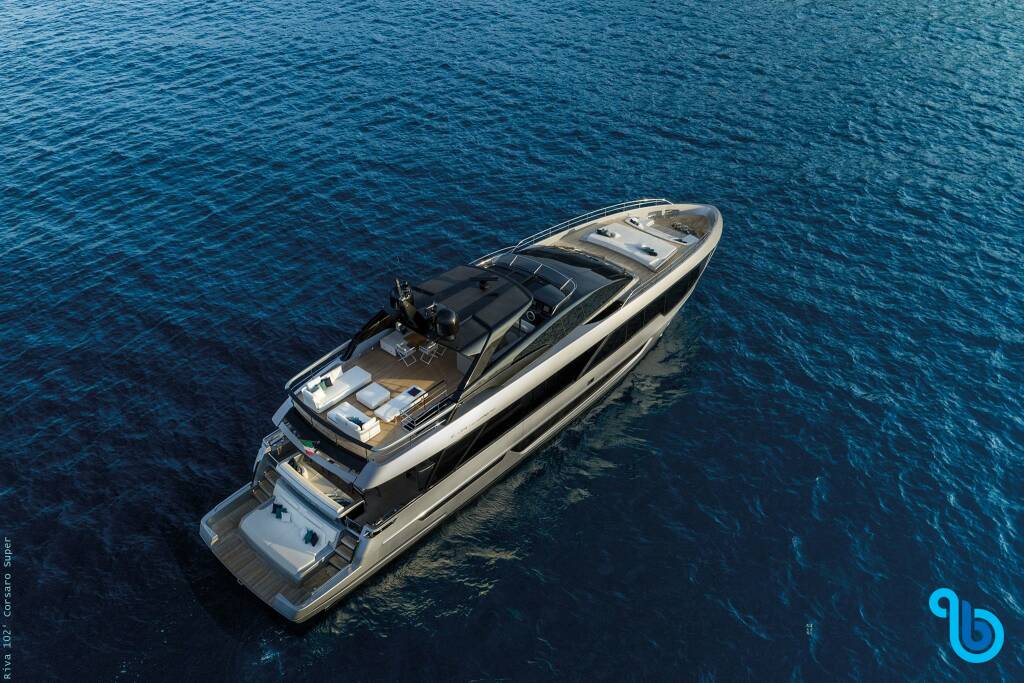 Riva 102 Corsaro Super Icona (Motor yacht),was launched in 2025 and is based in France - Côte d'Azur at Cannes, la Napoule. The hull is equipped with 5 cabins and 6 wc and comfortably can host 10 people.