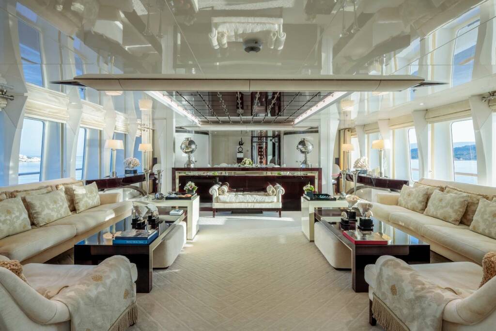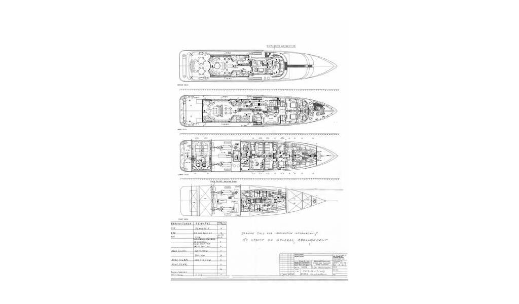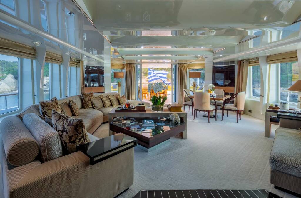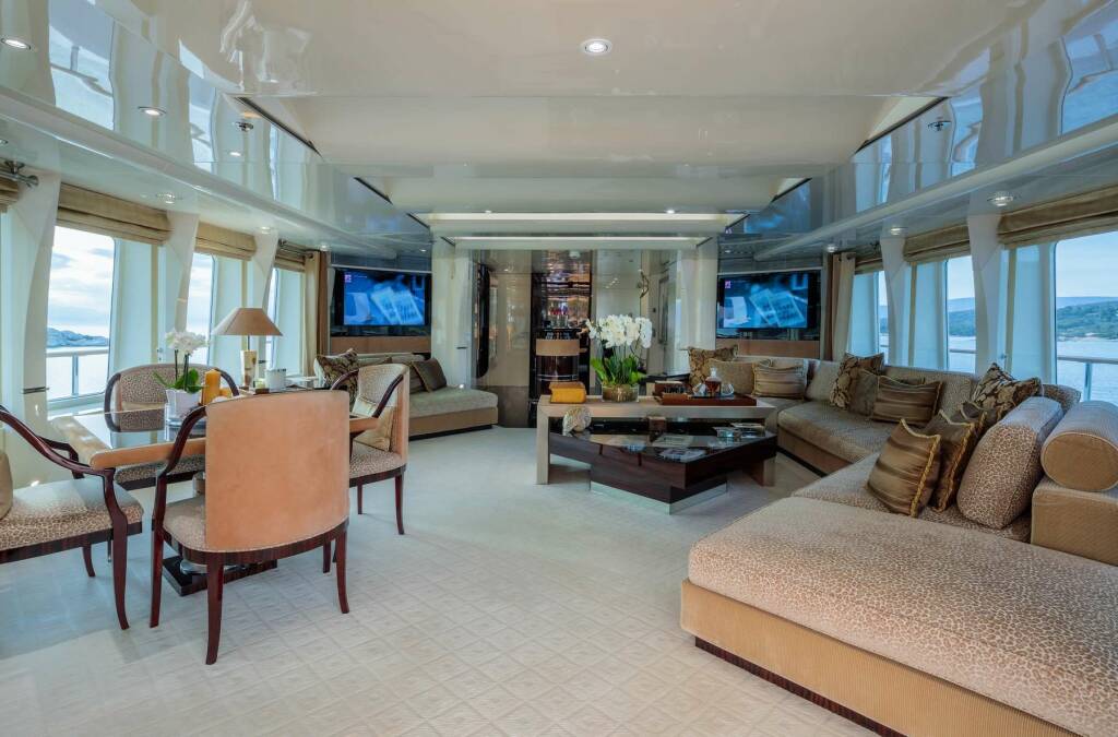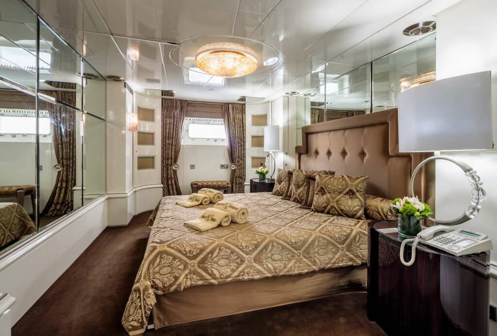 Accommodation: Master cabin with King size bed, his & hers bathroom with jacuzzi & sauna, his & hers walk in closets, mini bar, safe box and an office on the main deck