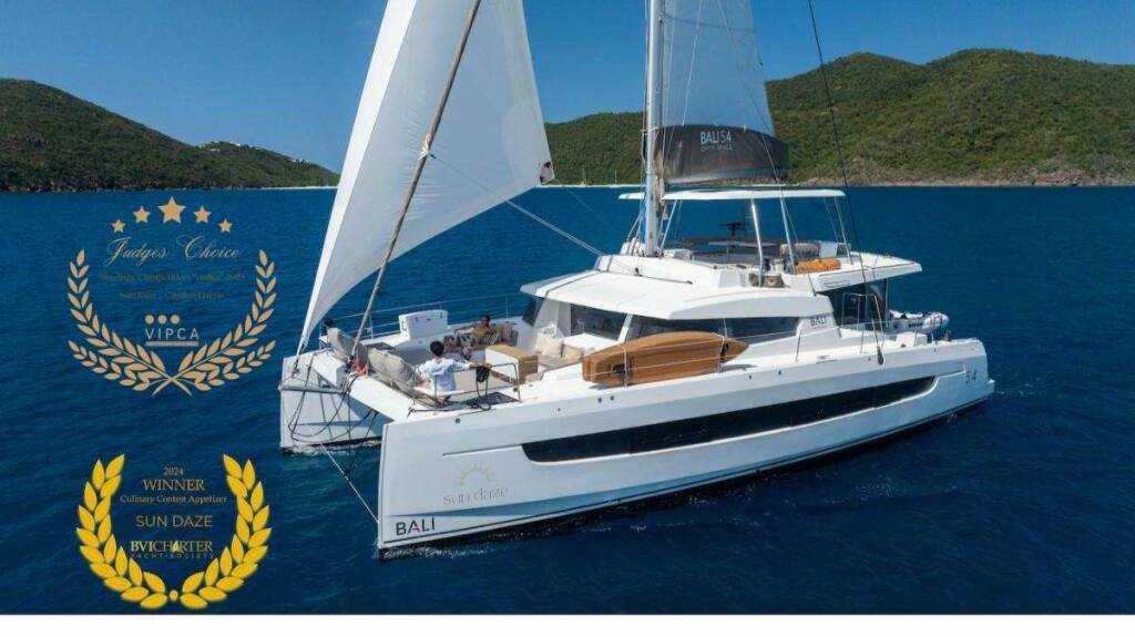 Luxury catamaran SUN DAZE, built in 2023 is anchored in the Caribbean Leewards, Caribbean Virgin Islands (BVI). It has 4 cabins, can accommodate 8 people.