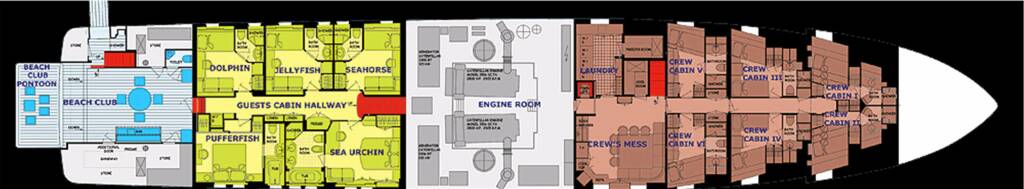• Catamaran for generous spaces, superior stability, and enhanced privacy.
