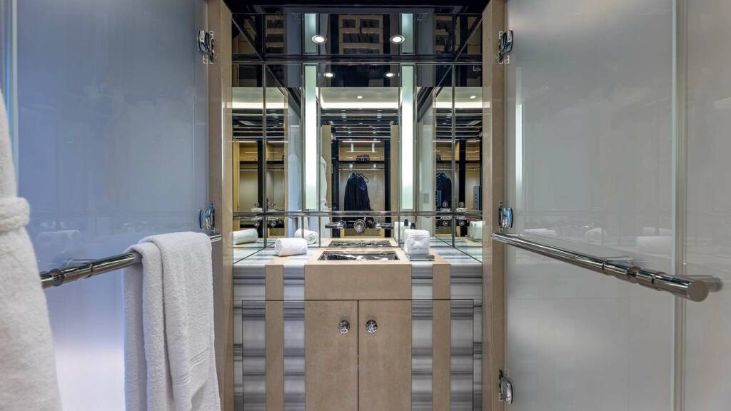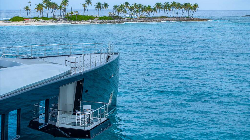 - Full beam master suite with a private balcony (on starboard) . The balcony comes with an air curtain to keep the interior spaces cool, whilst having the balcony open to the sea.