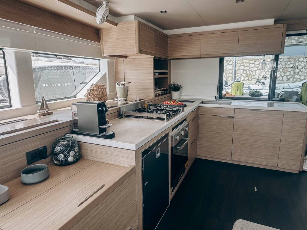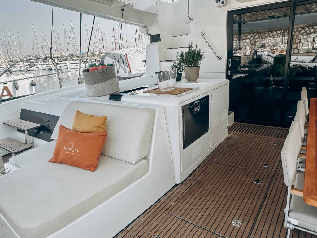 Luxury catamaran AURELIA, built in 2024 is anchored in the Greece. It has 4 cabins, can accommodate 8 people.