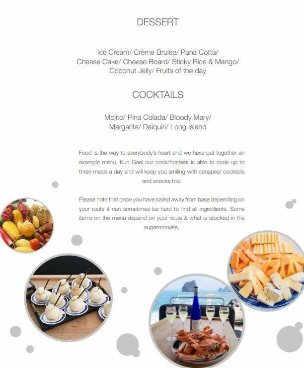 - Crew (1 Skipper + 1 Cook/Hostess)