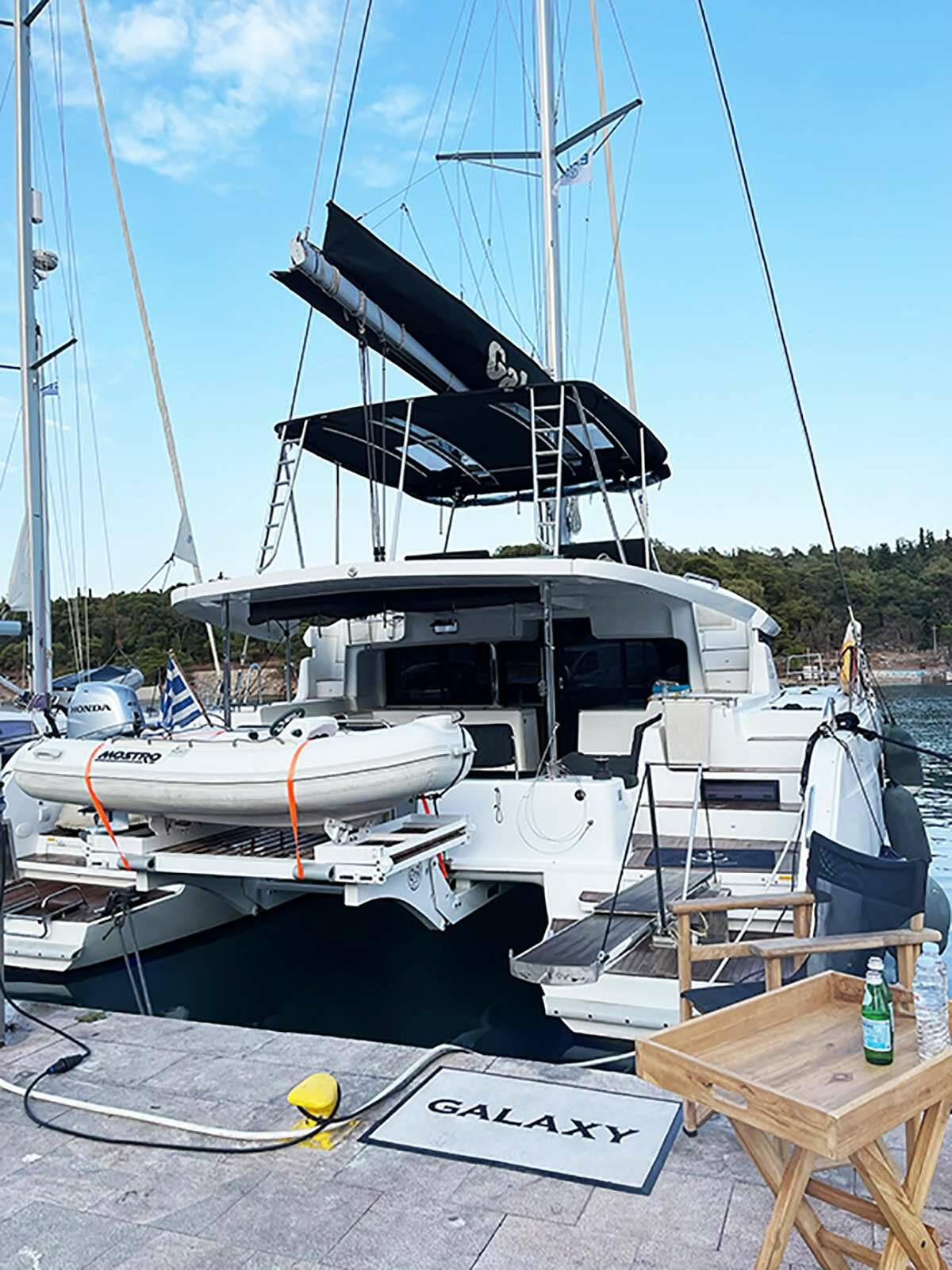 Luxury catamaran GALAXY, built in 2022 is anchored in the Greece. It has 4 cabins, can accommodate 8 people.
