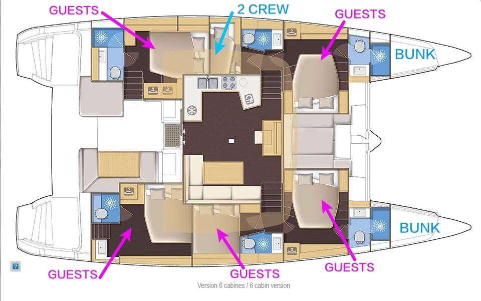 Accommodation: 6 cabin version (5 guests double cabins ensuite bath)