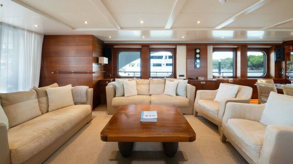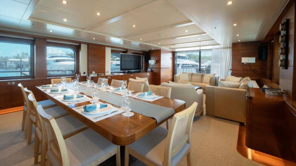 • MAIN DECK: Spacious aft deck for dining/ cocktails; main salon leads off the aft deck; powder room on the main deck foyer; Forward on the main deck is the master’s suite with private office. The suite spreads full beam to ensure privacy. There is plentiful wardrobe space and a large bathroom with bathtub, double shower and underfloor heating.