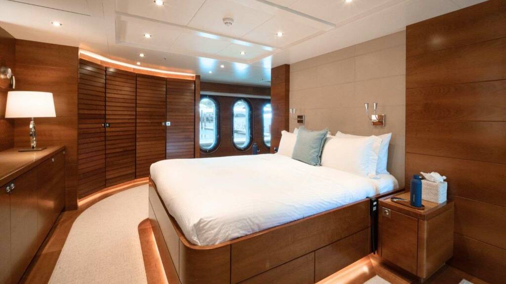 Forward on the main deck is the master suite with private office. The suite spreads full beam to ensure privacy. There is plentiful wardrobe space and a large bathroom with bathtub, double shower and underfloor heating.