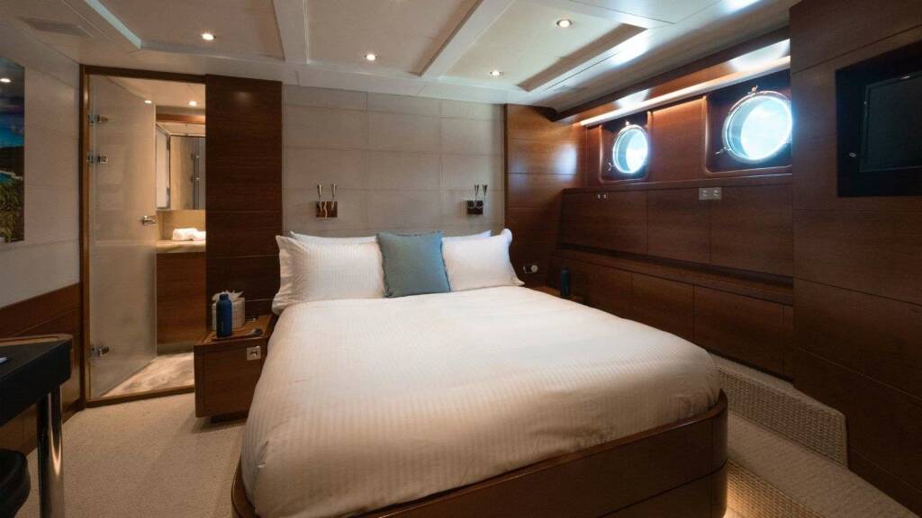2 x Double cabins. Consisting of a double bed (A mid-bed divider can separate into two singles), private ensuite and plentiful storage space.