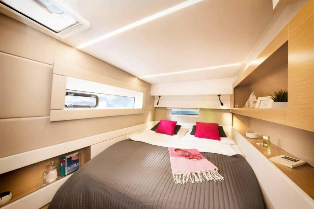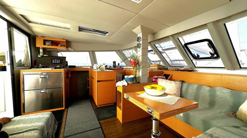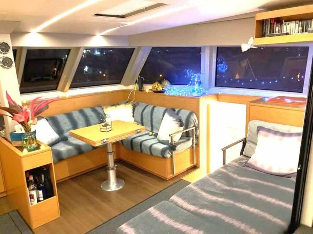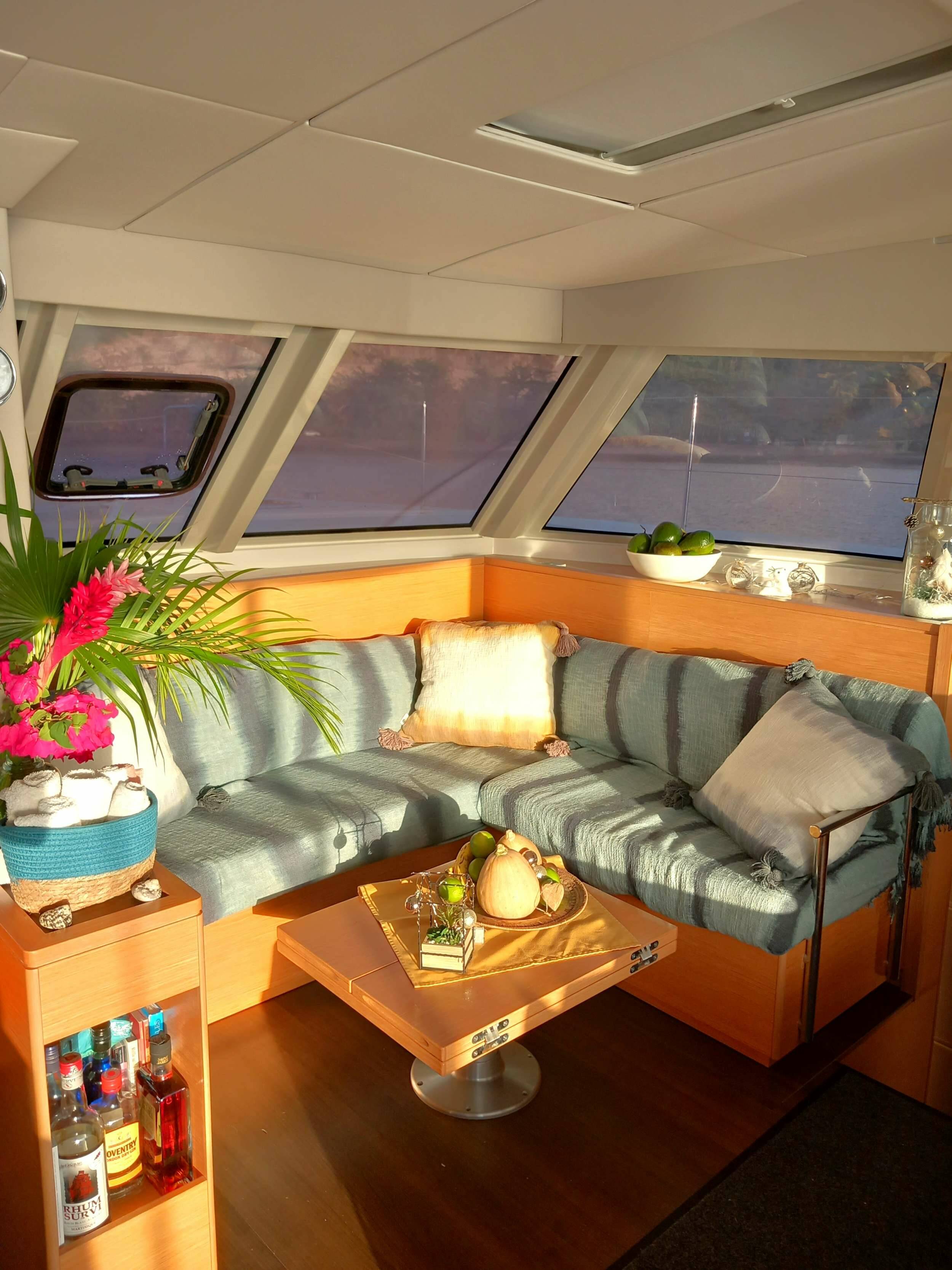 Accommodation: Illusion's 3 cabins, comprise 2 kings and one queen are ensuite with ipad dockers and electric fans. The starboard side cabins have a/c and the aft cabin to port has an excellent electric fan and overhead hatch for fresh sea breezes! All cabins are bathed in light thanks to large hull portholes with numerous storage spaces.