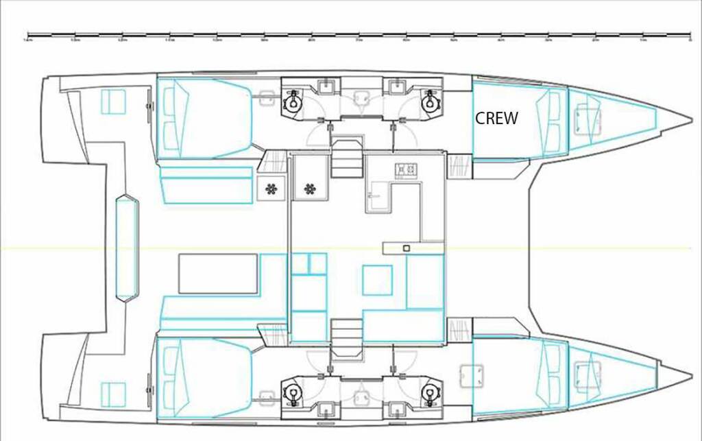 • Catamaran for generous spaces, superior stability, and enhanced privacy.