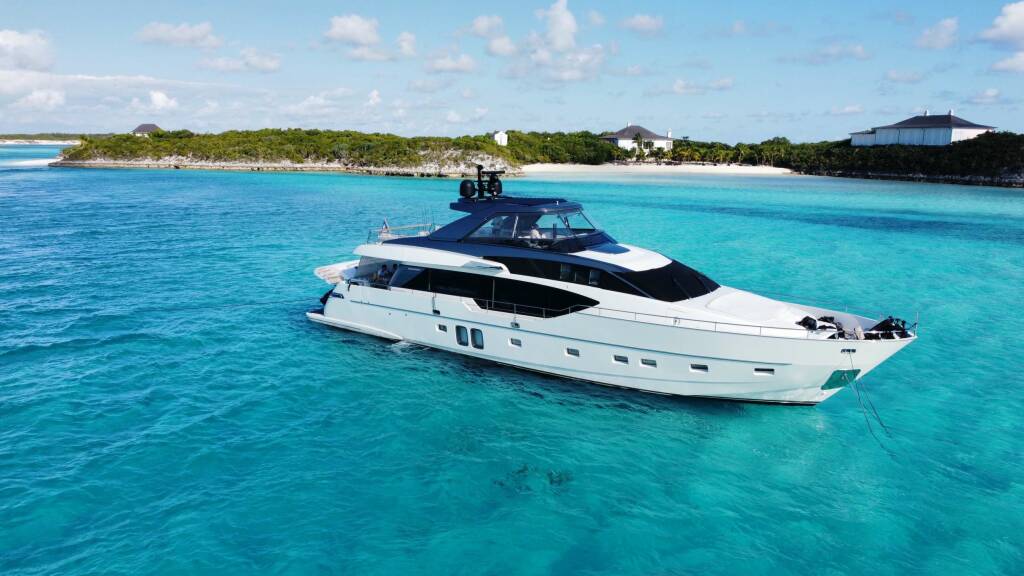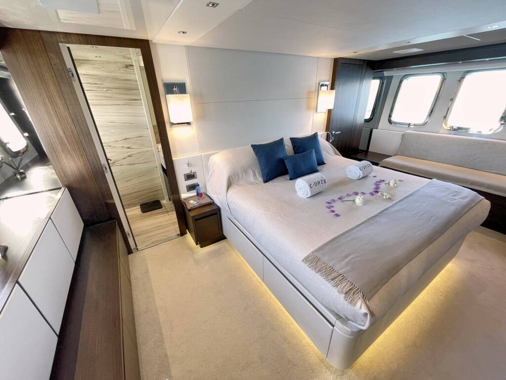 The flybridge is guest ready at all times and transforms to set the mood. Fitness enthusiasts can set up the weight bench, yoga mats or make use of the aft area for their own work-out program with or without one of the crew joining in for motivation. For those looking to celebrate an evening in style, this deck also transitions to an excellent party place/ dance floor with their $100k sound system, special lighting and more surprises. All of this, aside from the best place to relax in the sun or dine al fresco under the retractable rooftop after having cocktails at the bar. Optional shade provided both on the flybridge aft and the forward seating/ sunning area which is one of the best seats in the house for panoramic views.