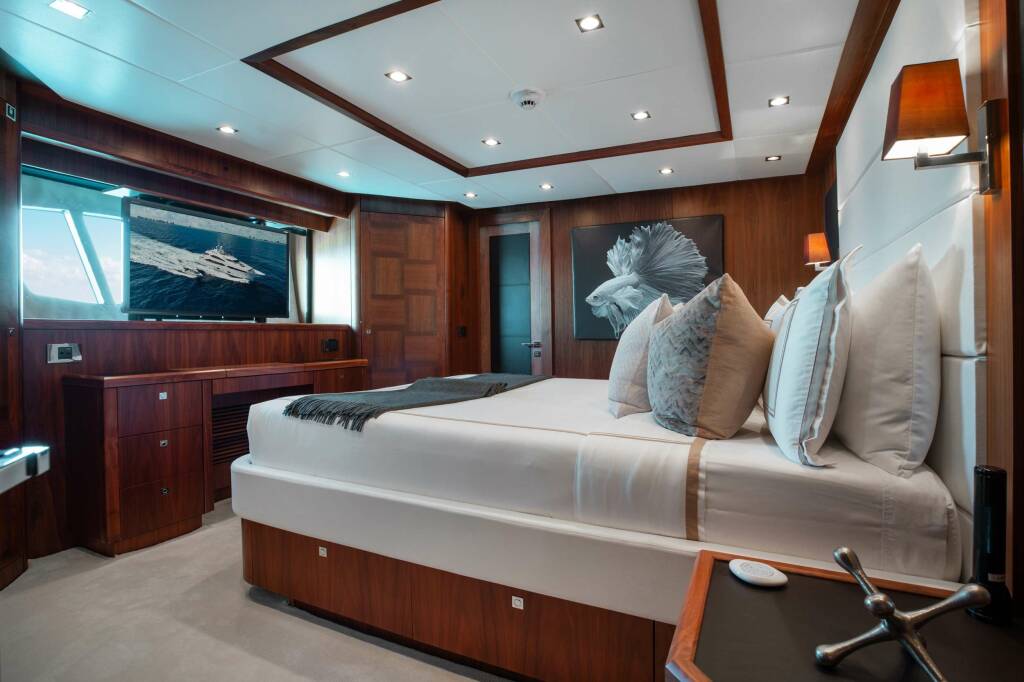 2 X DOUBLE VIP CABINS WITH ENSUITE on the lower deck, with writing desk, queen island bed, his and her cupboards, hull window, 40 inch flat screen TV with Sat TV, Apple TVand bose lifestyle DVD / Sterio and digital safe. The port and starboard aft VIP cabinsinclude double sinks in the ensuite, Techma toilet and bidet. Sony Flat screen TV which popup in these cabins.