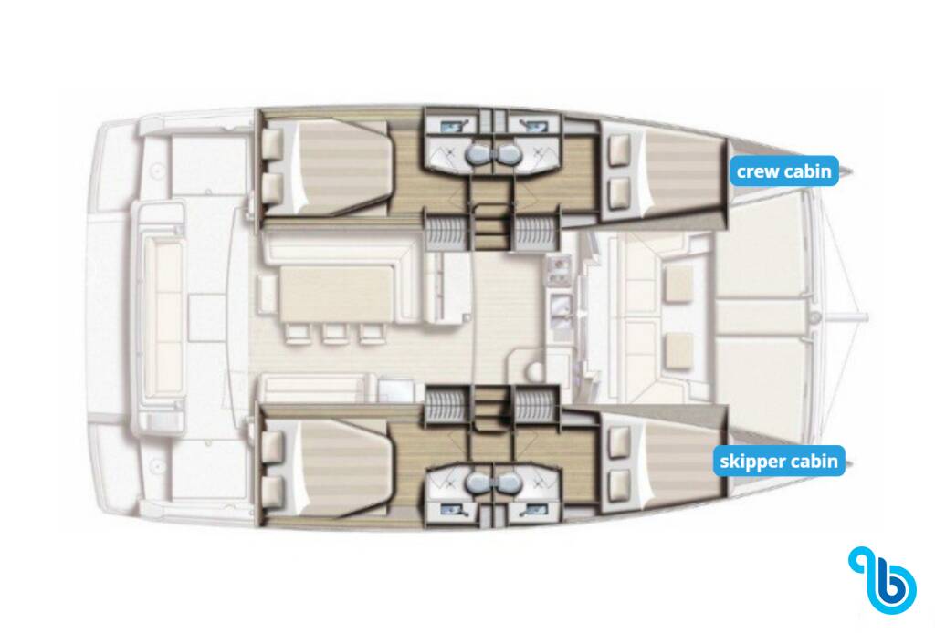 El patrón no está incluido en el precio del barco. Será posible añadir el patrón durante el procedimiento de confirmación: el coste suele oscilar entre 180 y 250 euros por día; el patrón necesita un camarote exclusivo. Tras consultar con un operador de BeBlue, será posible solicitar que el patrón duerma en la dinette (salón central).