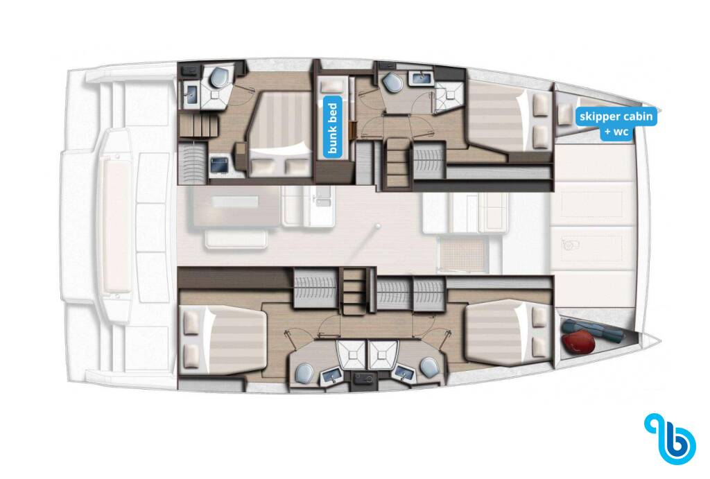 El patrón no está incluido en el precio del barco. Será posible añadir el patrón durante el procedimiento de confirmación: el coste suele oscilar entre 180 y 250 euros por día; el patrón necesita un camarote exclusivo. Tras consultar con un operador de BeBlue, será posible solicitar que el patrón duerma en la dinette (salón central).