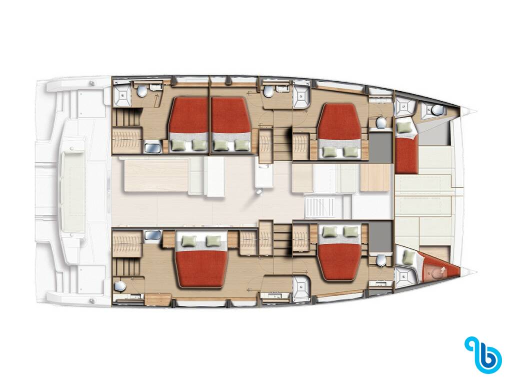 Cabinas 5 (1 master suite, 4 double cabins, ensuite WCs; CREW: 2 front peaks + WC)