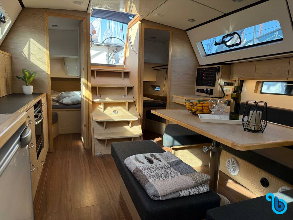 El patrón no está incluido en el precio del barco. Será posible añadir el patrón durante el procedimiento de confirmación: el coste suele oscilar entre 180 y 250 euros por día; el patrón necesita un camarote exclusivo. Tras consultar con un operador de BeBlue, será posible solicitar que el patrón duerma en la dinette (salón central).