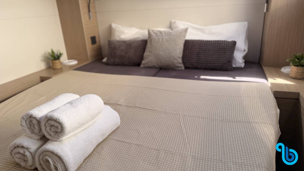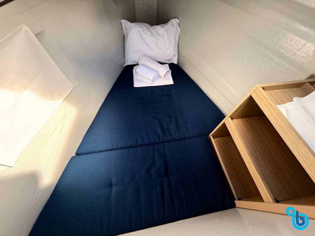El patrón no está incluido en el precio del barco. Será posible añadir el patrón durante el procedimiento de confirmación: el coste suele oscilar entre 180 y 250 euros por día; el patrón necesita un camarote exclusivo. Tras consultar con un operador de BeBlue, será posible solicitar que el patrón duerma en la dinette (salón central).