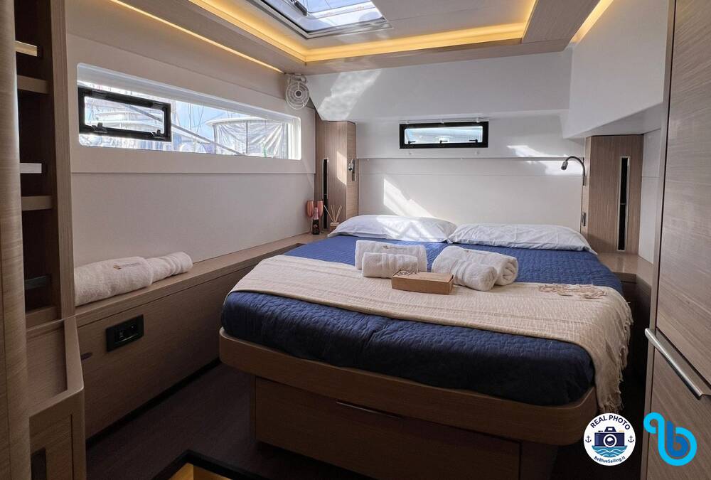 El patrón no está incluido en el precio del barco. Será posible añadir el patrón durante el procedimiento de confirmación: el coste suele oscilar entre 180 y 250 euros por día; el patrón necesita un camarote exclusivo. Tras consultar con un operador de BeBlue, será posible solicitar que el patrón duerma en la dinette (salón central).