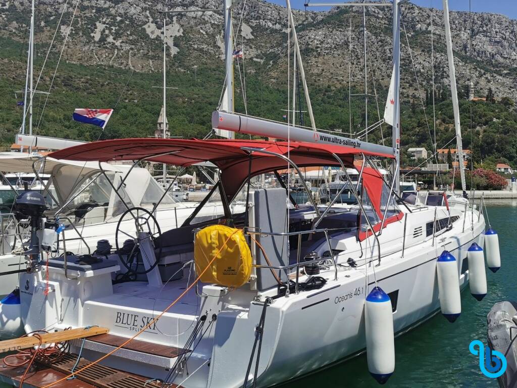 El Oceanis 46.1 BLUE SKY (Velero), fue botado en el 2024 y tiene base en Región de Dubrovnik de la ciudad de Komolac, ACI Marina Dubrovnik. El casco está configurado con 5 cabinas y 3 wc y está homologado para alojar cómodamente 10 + 2 personas.