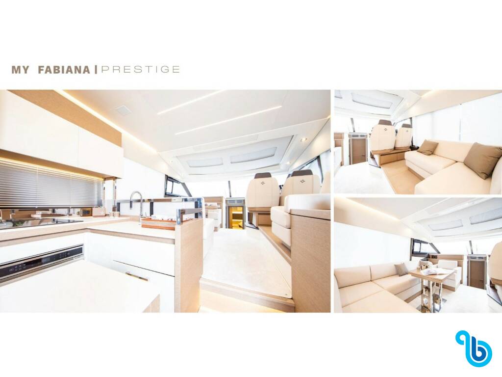 El Prestige 520 S Fabiana (Barco a motor), fue lanzado en 2022 y tiene su sede en Campania en el puerto deportivo de la ciudad de Pozzuoli. El casco está equipado con 3 cabinas de barco y 2 wáter y está aprobado para acomodar cómodamente 8 gente .