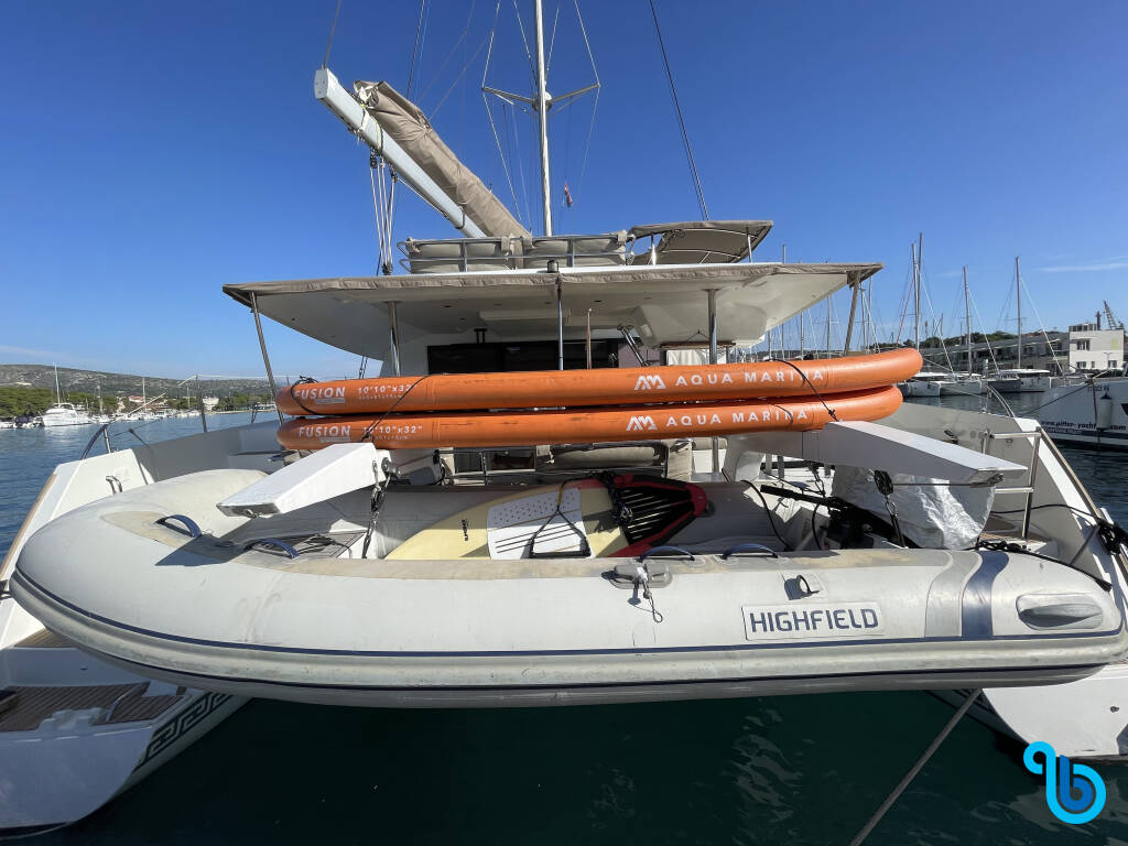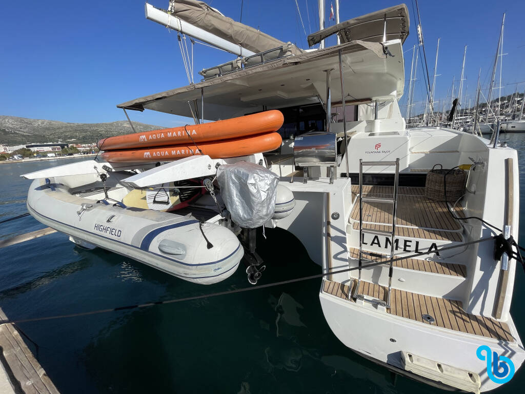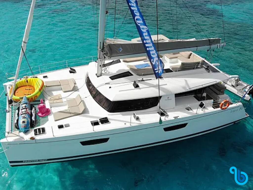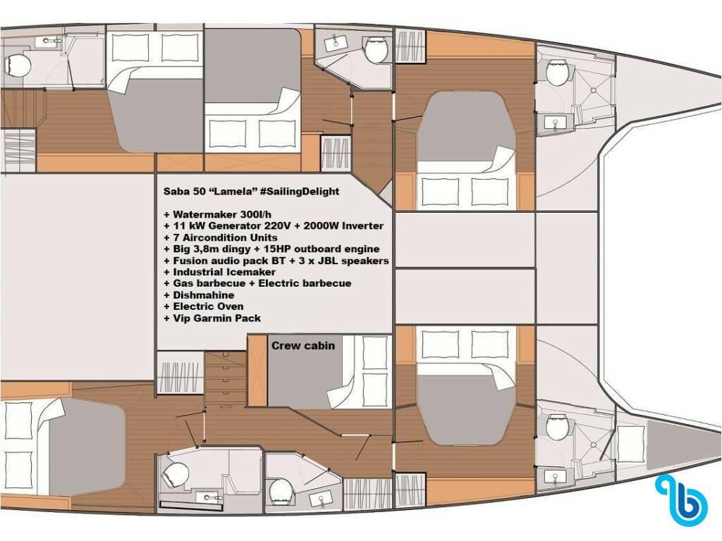 El Saba 50 Lamela (Catamarán), fue lanzado en 2018 y tiene su sede en Islas jónicas en el puerto deportivo de la ciudad de Lefkas, Marina Lefkas. El casco está equipado con 6 cabinas de barco y 6 wáter y está aprobado para acomodar cómodamente 14 gente .