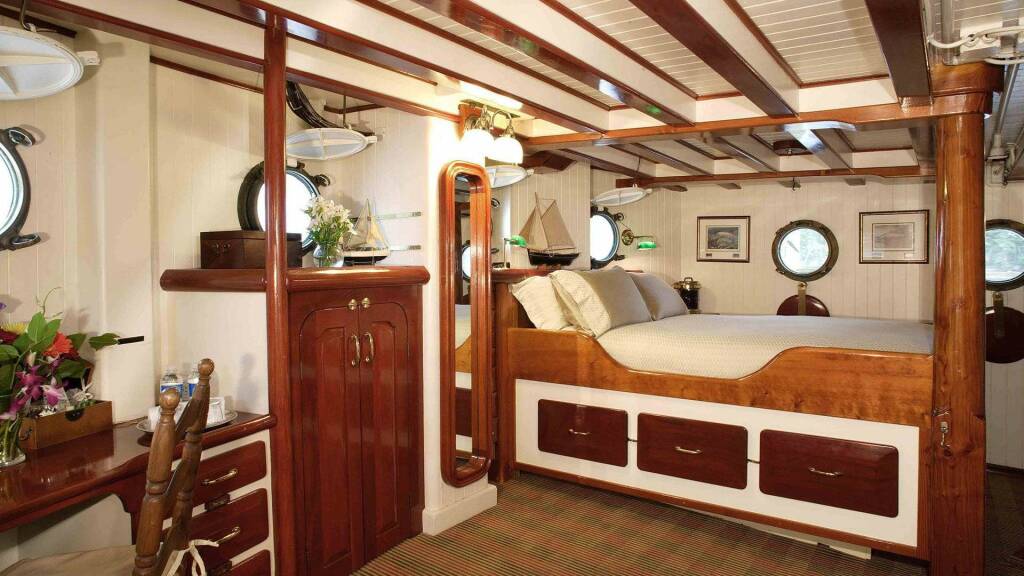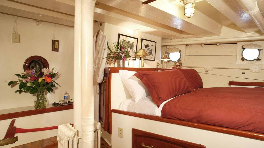 Sleeps 3. DOUBLE bed on one side. Drop down Pullman SINGLE bed on the other side. Two opening portholes. Private bathroom is across the hall, with shower.