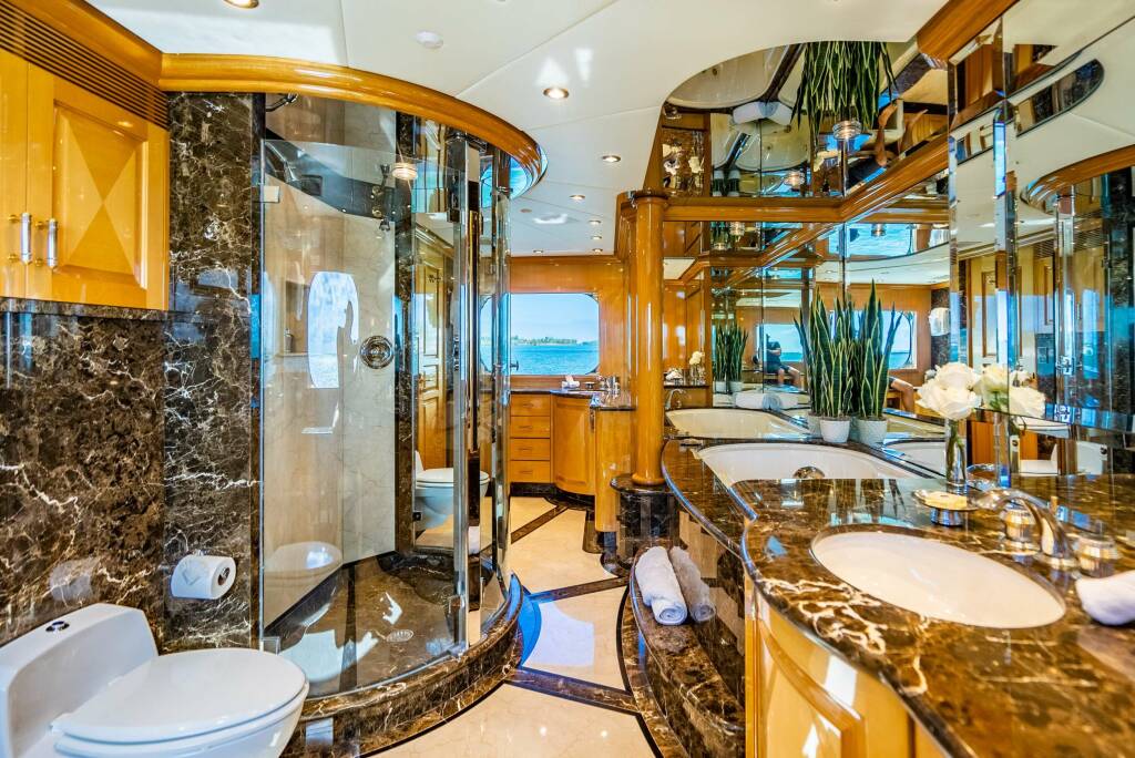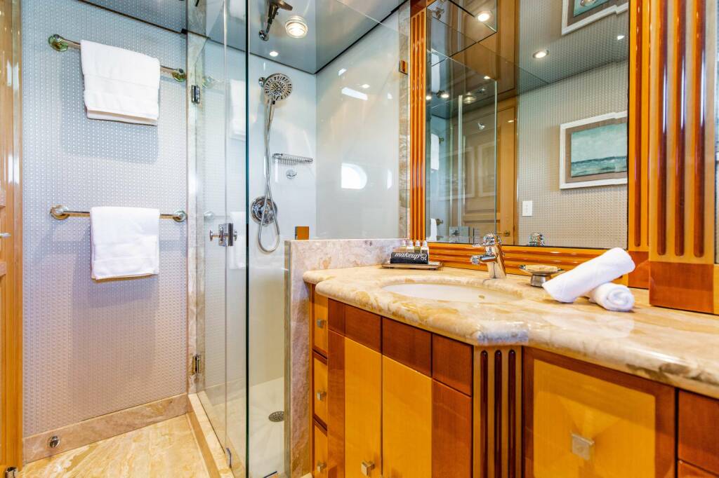 Accommodation: SeaQuest accommodates 10 guests in 5 spacious staterooms. The on-deck master stateroom as a king bed, full width His and Hers bath with marble shower and Jacuzzi tub. Below deck there four guest staterooms to include two VIP Queen staterooms aft to port and starboard. Forward, is an additional Queen stateroom and to starboard is the twin stateroom to port. All guest staterooms have an en-suite bath.