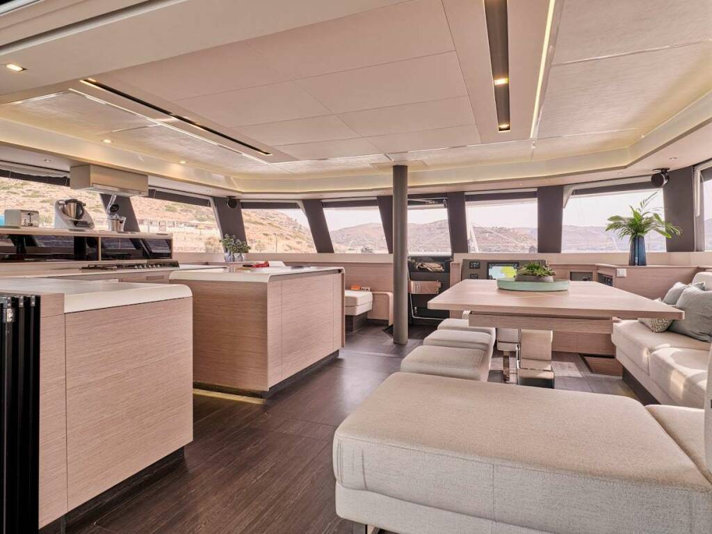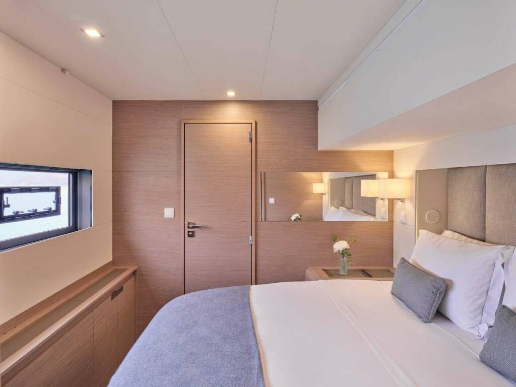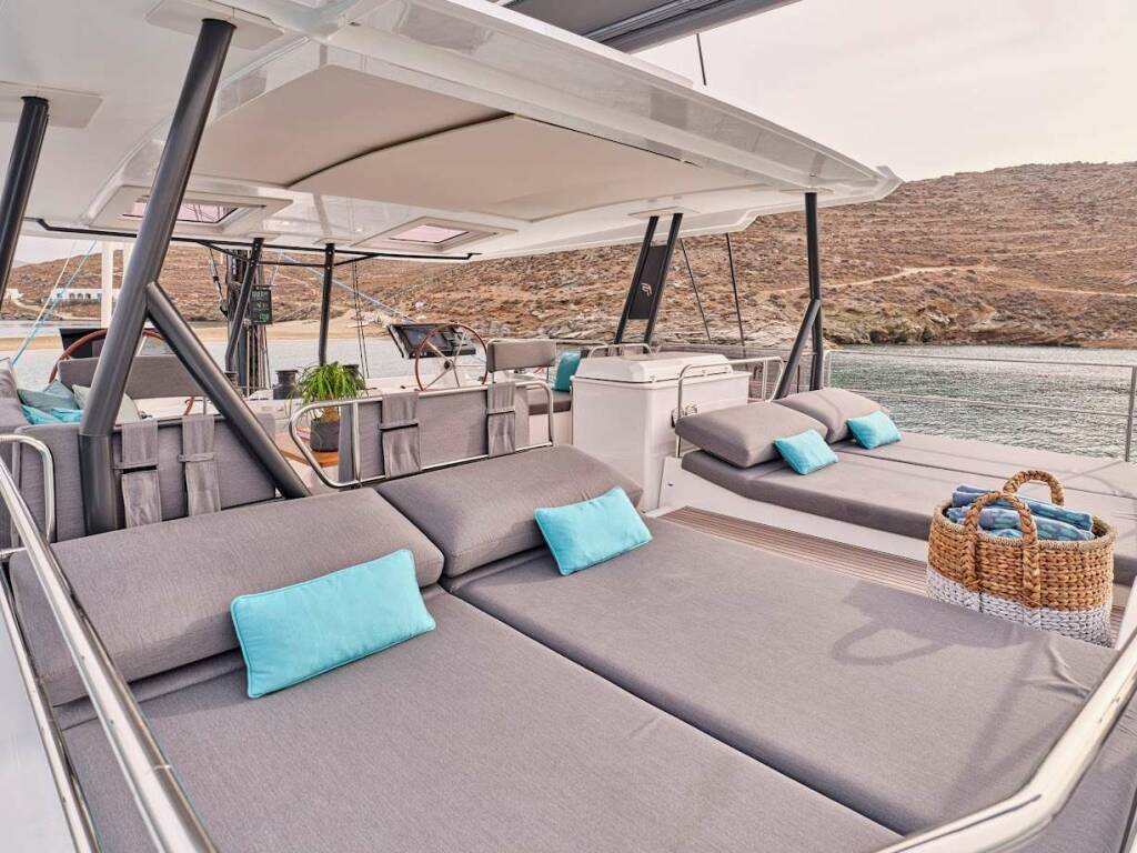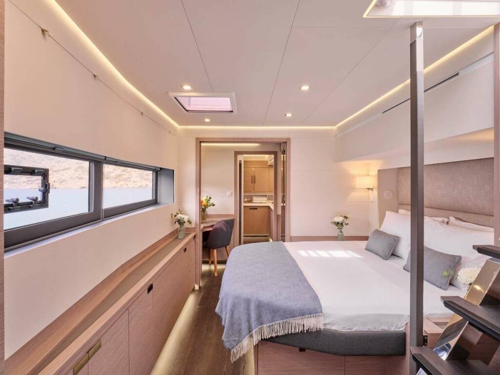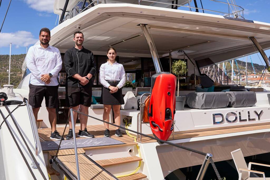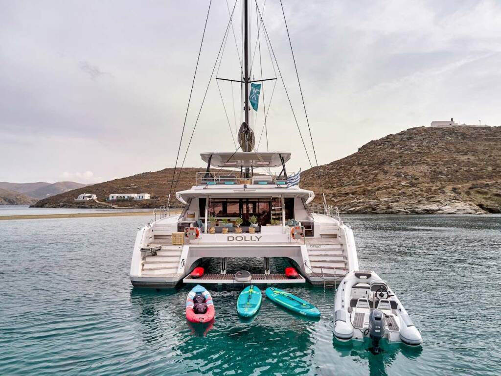 Catamarán de lujo DOLLY, construido en 2023 está anclado en Greece. Tiene 5 cabinas, puede acomodar 10 personas.