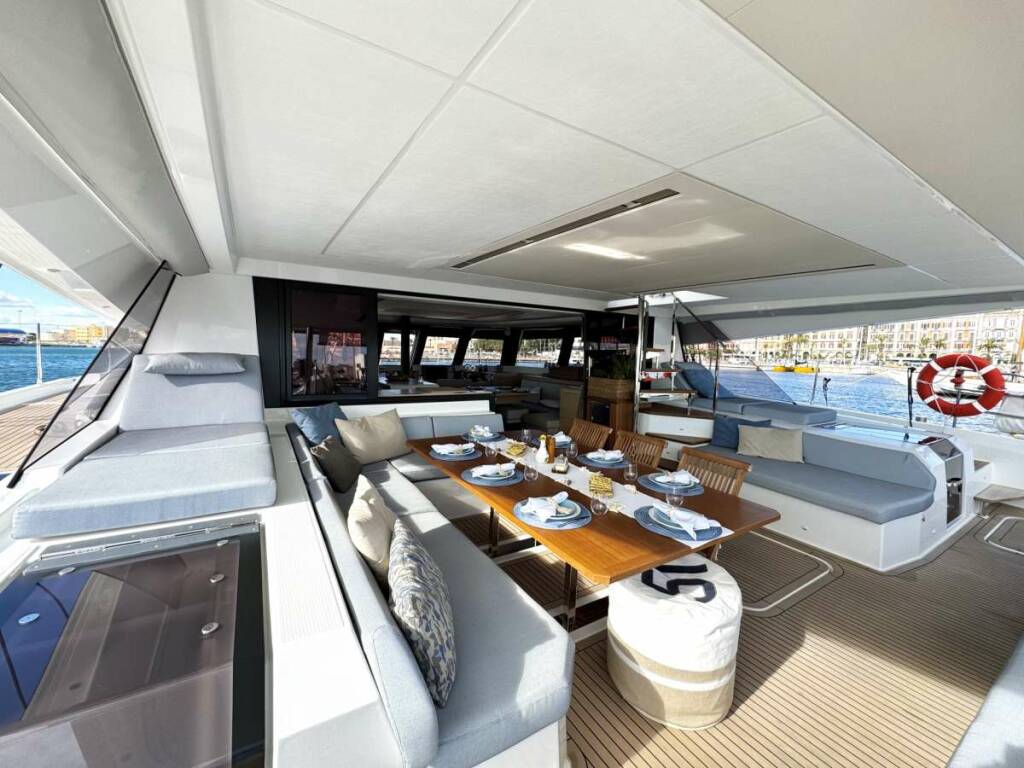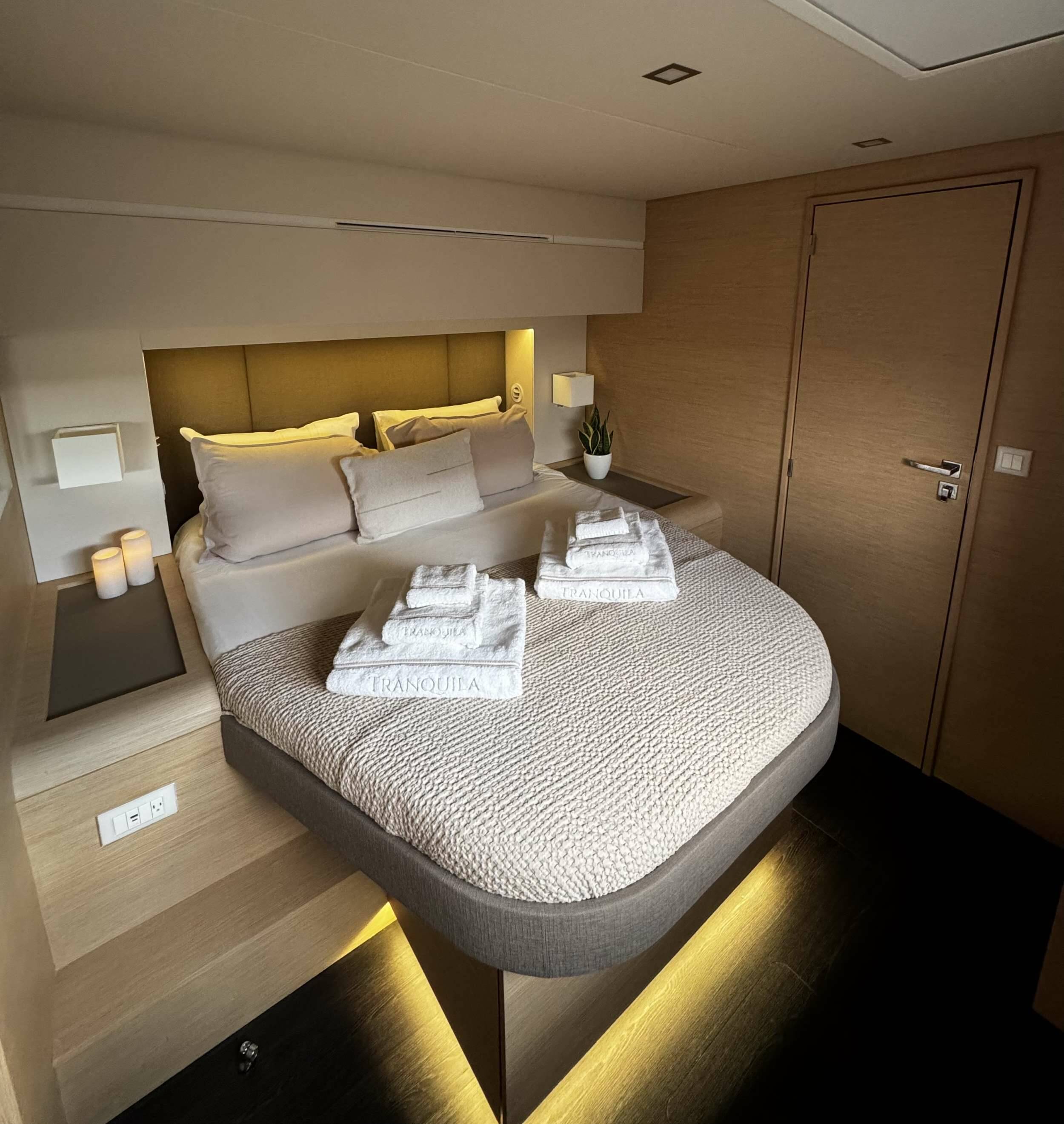 Catamarán de lujo Tranquila, construido en 2024 está anclado en Caribbean Virgin Islands (BVI). Tiene 4 cabinas, puede acomodar 8 personas.