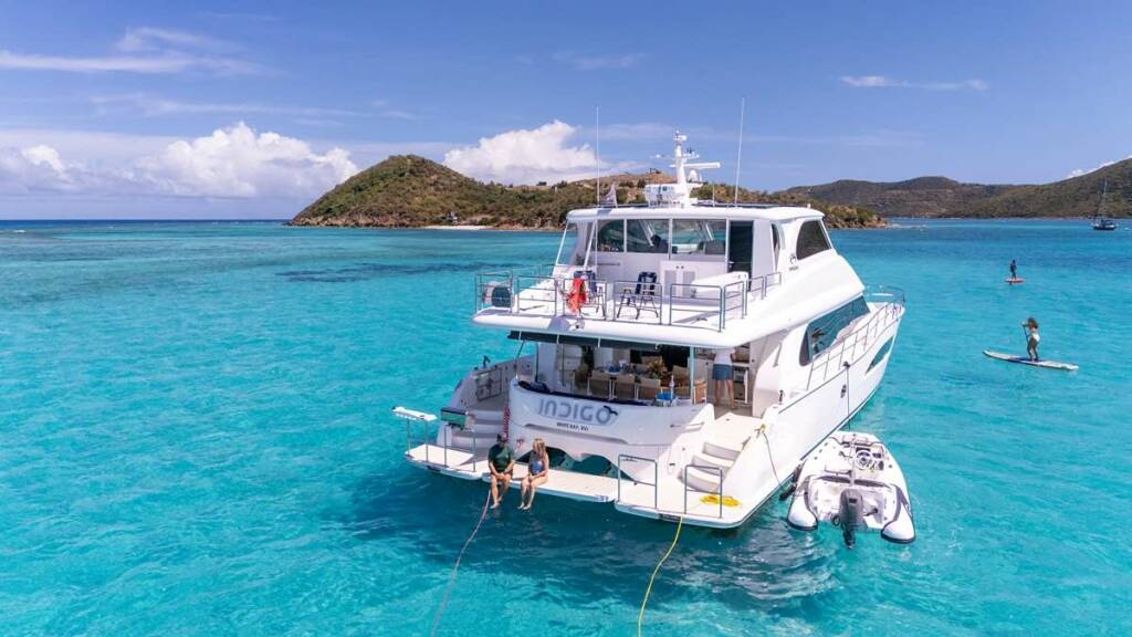 Catamarán de lujo INDIGO , construido en 2024 está anclado en Caribbean Virgin Islands (BVI). Tiene 3 cabinas, puede acomodar 6 personas.