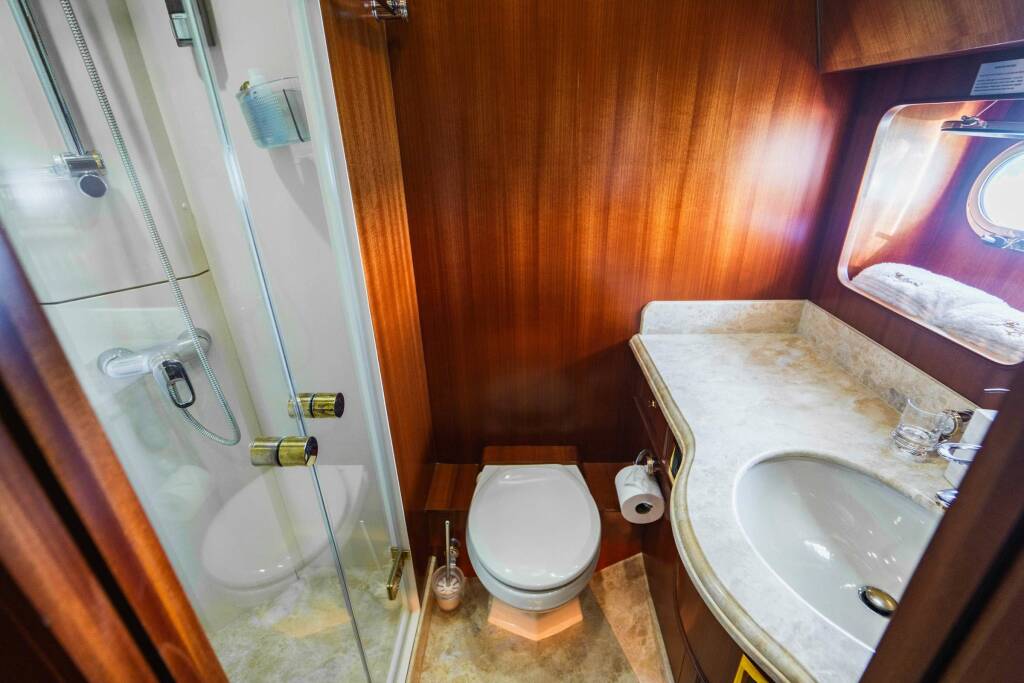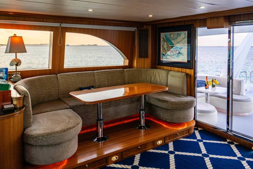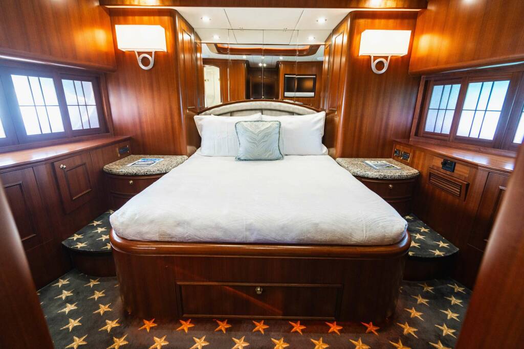Accommodation: LEXINGTON features four staterooms each with en-suites, including his and hers baths in the master, which offers a king bed, while the VIP + starboard guest cabins have queen berths, and the port guest cabin has bunk-style twins. The main salon is outfitted with a large, brand-new sofa, pop-up TV and bar. Forward of the salon is the formal dining area that can seat up to eight guests. Moving forward, you'll find a wrap-around galley that includes a country-style dinette. The bridge + sky lounge is extended and features a day-head, bar and flat-screen TV, as well as a spacious seating area and grill on her aft deck.