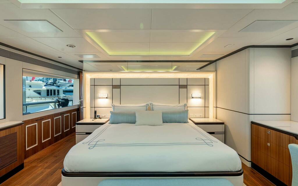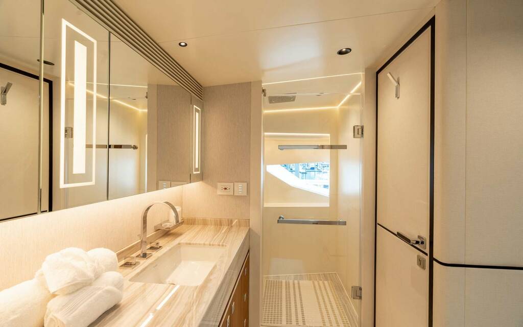 Accommodation: Large Owner suite with King bed is positioned forward facing on the main deck with full length bathroom featuring double sinks, shower, private toilet enclosure and ample hanging and drawer storage.