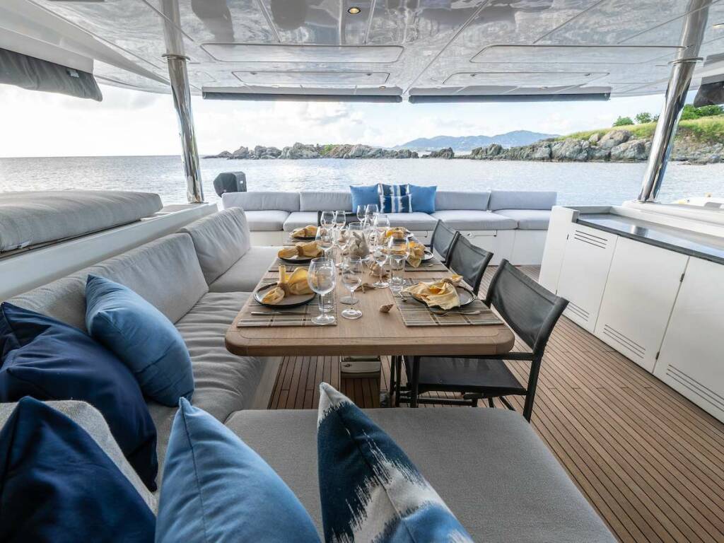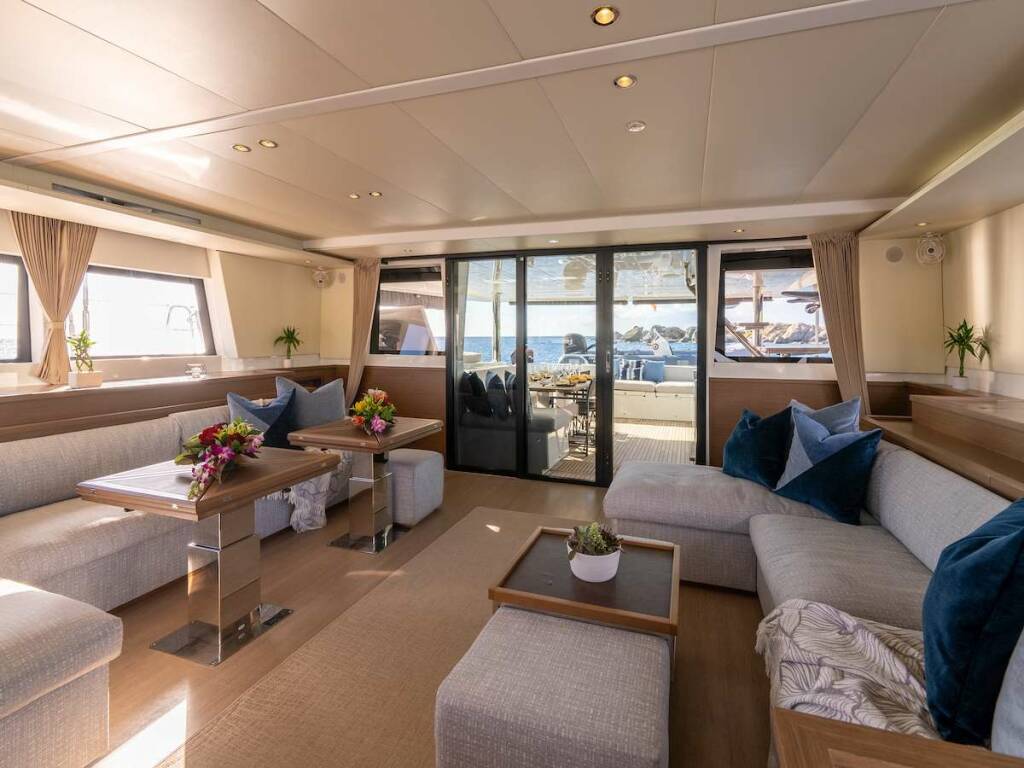 Large salon for lounging with a large pop-up TV, or formal dining. Large aft deck lounge and alfresco dining area with access to the water on two wide sugar scoops with SS steel ladders and deck showers. On top, a spacious fly-bridge with a 360-degree view, fridge, bar, and lounge area. On the bow, two large lounge areas, trampolines, and bow seats for spotting dolphins.