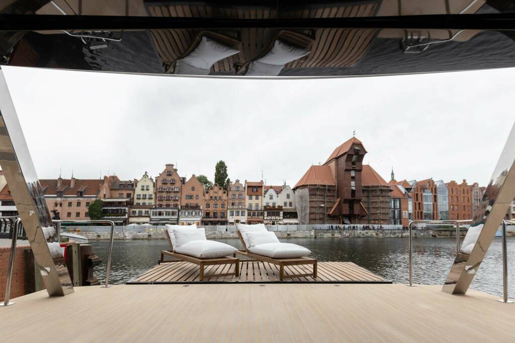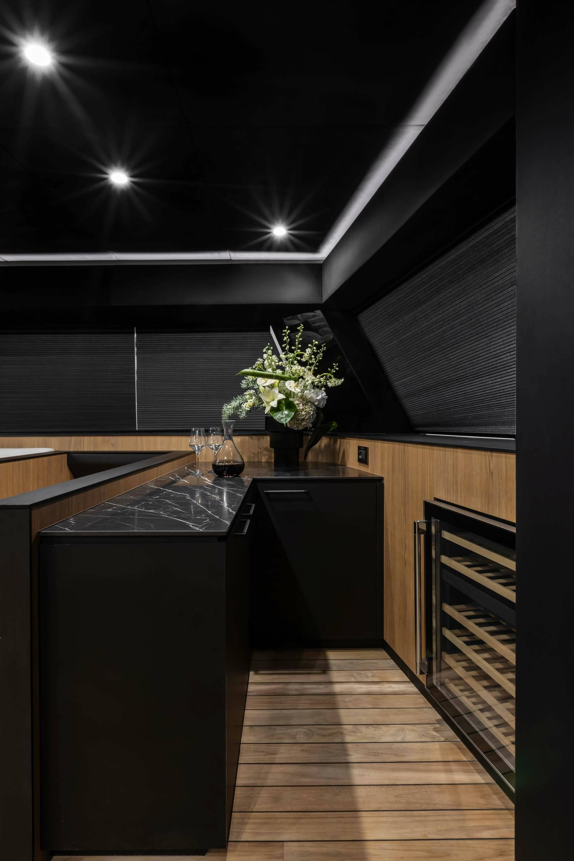Aft Cockpit: A shaded outdoor lounge ideal for long, leisurely lunches, sunset cocktails, or watching the action in the water.