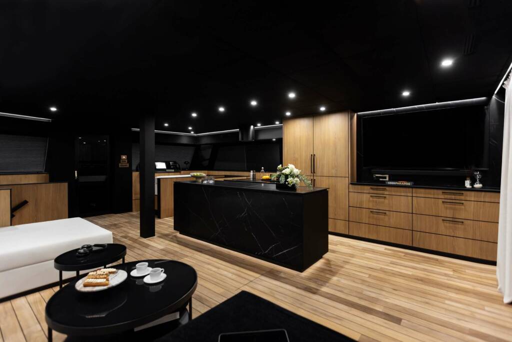 Main Salon: A bright, open-plan interior with panoramic views, sophisticated décor, and plush seating—perfect for relaxing or enjoying a movie.