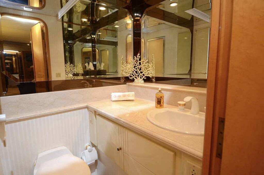 Suite Life’s luxury staterooms are all appointed with percale sheets, Egyptian cotton towels and robes to provide ultra comfort during guests private yacht charter. The Master Silver Palm Suite has a King bed, walk-in closet, security box, vanity table, sofa and master bathroom with full jacuzzi.The VIP Bay Rum Suite has a walk-around queen and walk-in closet. The port side Spice Berry Suite guest stateroom has a queen bed and large closet. The starboard Wild Coral Suite guest stateroom has a full bed and twin.