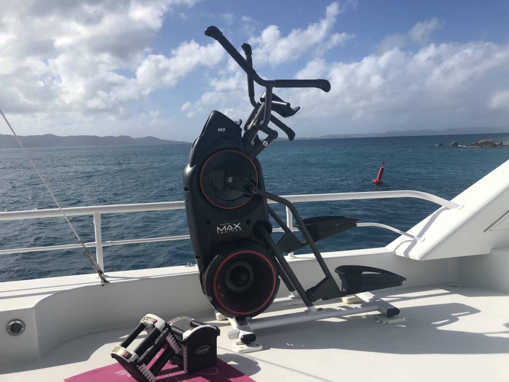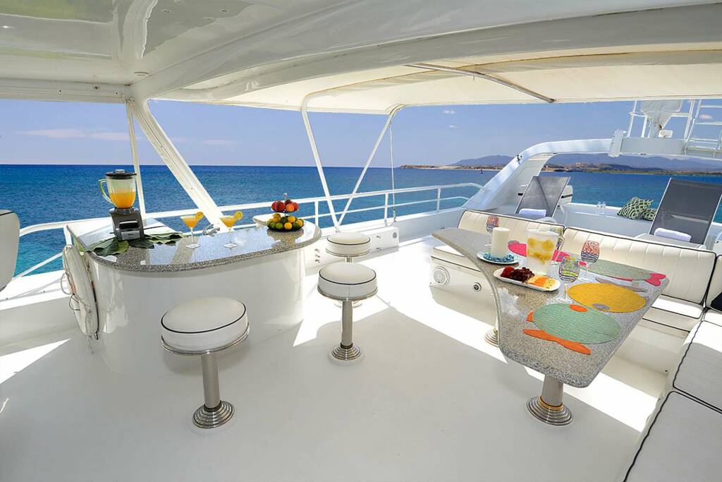 Gaze at a new sunrise every morning while you workout on the BowFlex elliptical or sip coffee in the aft alfresco teak dining area. Bask the day away relaxing on the upper deck lounges, over-sized bow sun pad, or if you prefer, snorkeling right off the expansive swim platform. End the day, toasting with champagne in the outdoor bow Jacuzzi.